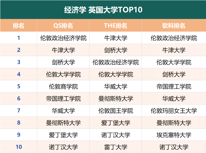 分别在三大排名的“经济学”学科中,位列前10的英国大学有👇