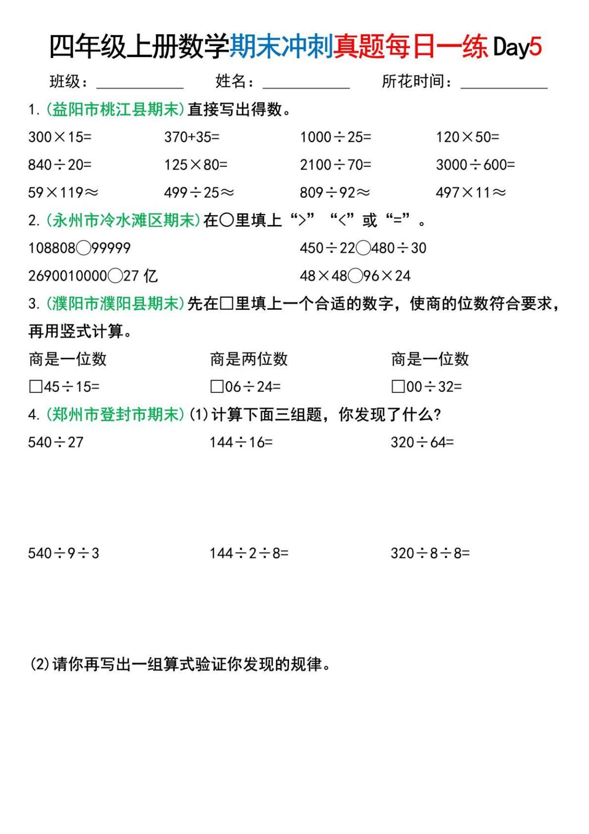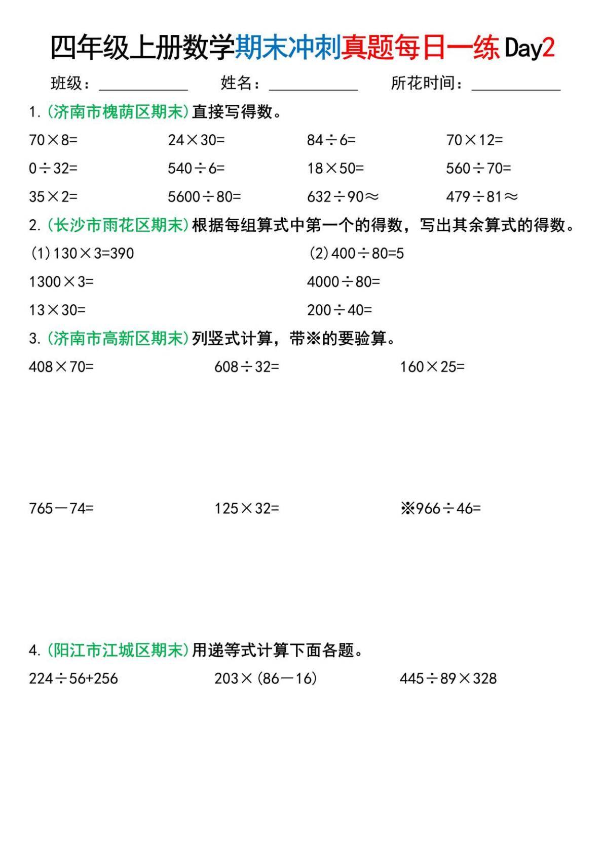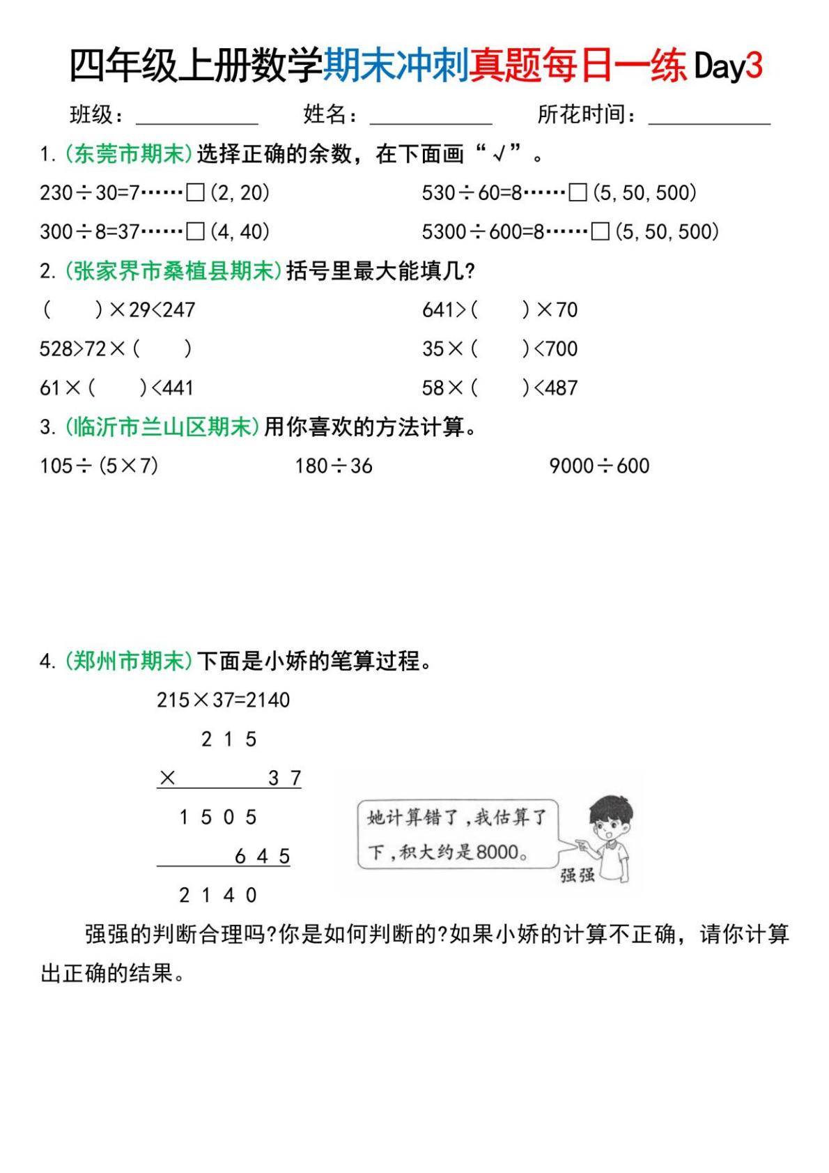 对于学生的学习,这份资料的帮助较为实际:首先,它以期末真题为载体,能让学生熟悉不同地区的考试题型,明确计算模块的常考形式,多样的计算练习能巩固学生的运算能力,提升乘除法计算的准确性与熟练度,同时强化对运算顺序、验算方法的掌握;余数、商的位数等细节题型,能帮助学生关注计算中的易错点,减少考试中的细节错误;“每日一练” 的形式便于学生分阶段练习,逐步提升计算能力,同时通过真题练习了解自身的薄弱环节,进行针对性巩固。整体而言,这份材料贴合四年级数学期末复习的需求,是提升计算能力、熟悉考试题型的实用练习工具。