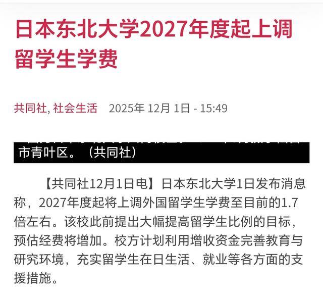《日本东北大学2027年度起上调留学生学费》 共同社 2025年12月1日
