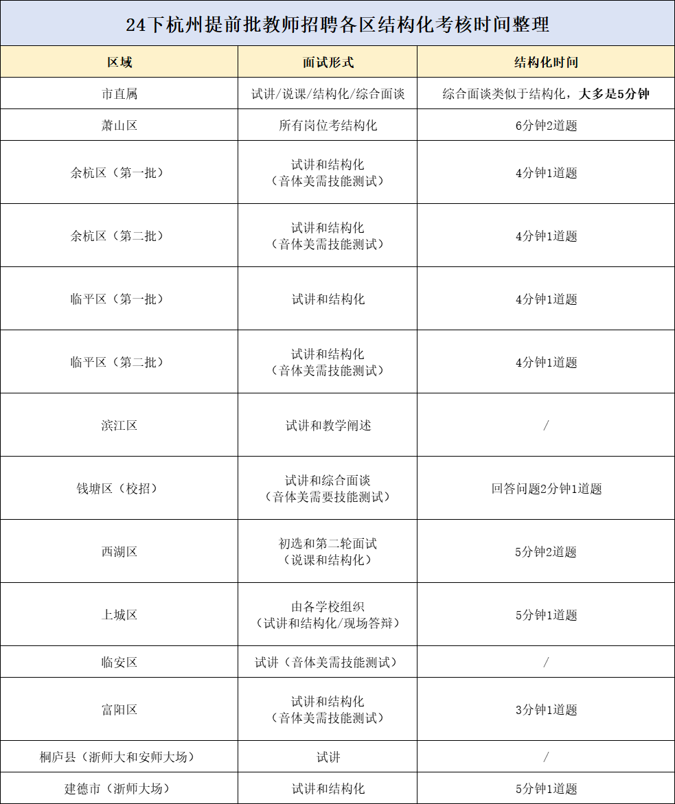 2、一些区域虽然不直接写结构化,但实质考点和形式都与结构化其实是差不多的:市直属&钱塘考察的综合面谈,其核心都属于结构化问答;上城区的现场答辩,题型和考法也与结构化有相似之处。而且今年钱塘区已在公告中明确写出:试讲+结构化,