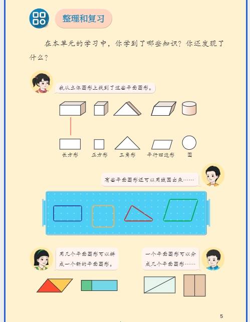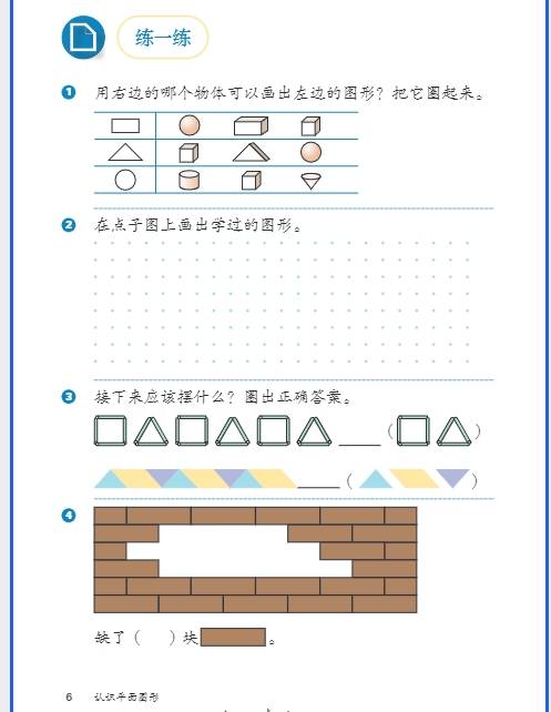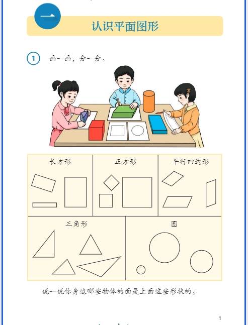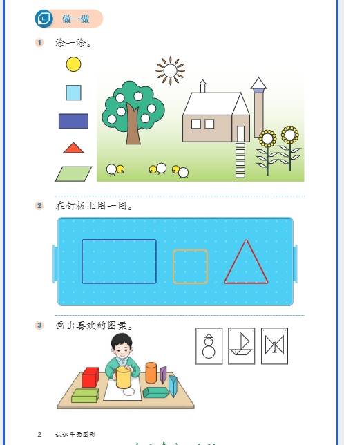 - 实物辨认:在家中找长方形(课本)、正方形(魔方)、圆形(盘子)、三角形(三角尺)等图形,让孩子描述 “边有几条、角是什么样”,建立图形特征的直观印象。