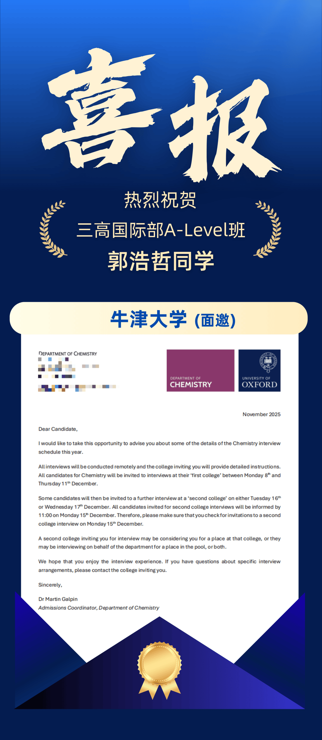 近日,牛津大学开始发放2026年面试邀请offer,深圳第三高级中学国际部A-Level学子郭浩哲凭借其卓越的学术实力与综合素养成功获得其面试邀请。