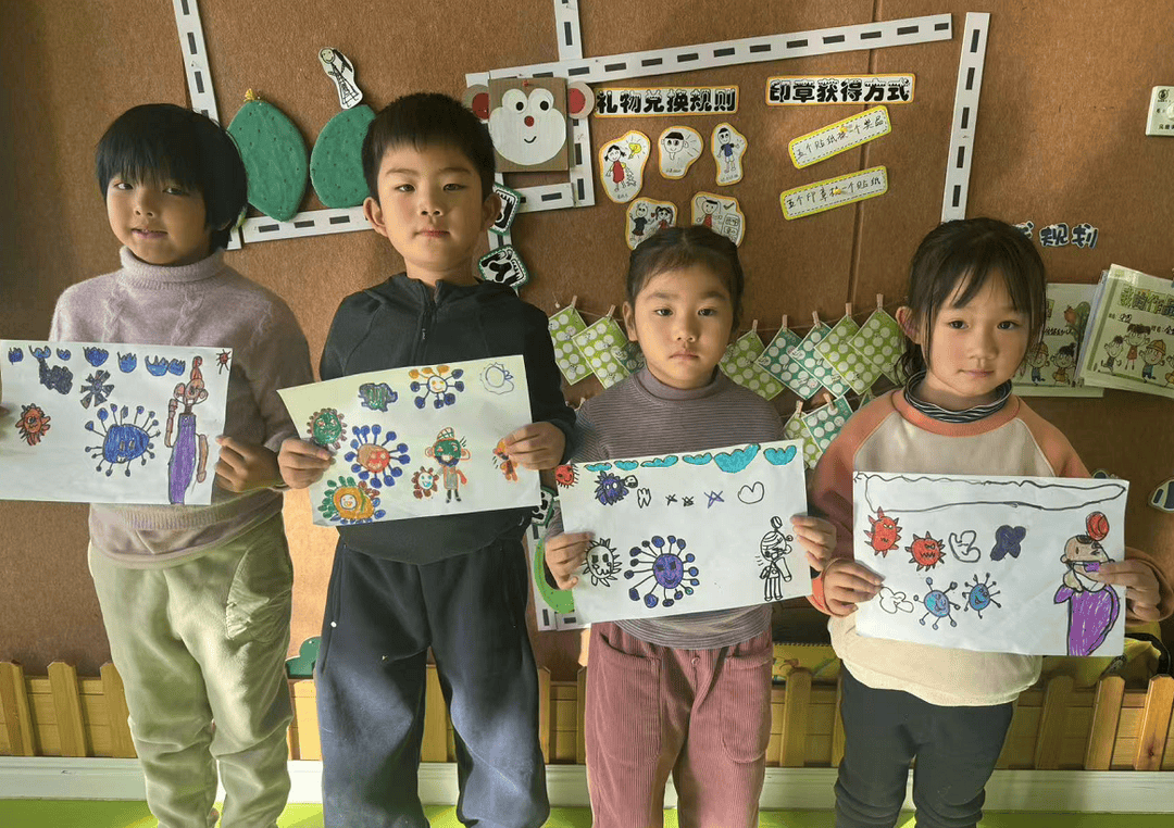 活动中,各年级组结合幼儿年龄特点设计了丰富多样的内容。大班幼儿通过绘本共读《流感病毒我不怕》、观看动画等形式认识流感,还绘制 “生病时的感觉” 画作,直观掌握流感常见症状;园方同步向家长发放《流感知识家长告知书》,搭建家园共育桥梁。中班组聚焦防控实操,通过 “洗手歌” 教学让幼儿掌握七步洗手法,开展咳嗽礼仪演练和口罩佩戴练习,同时以趣味实验模拟病毒通过握手、触摸传播的过程,引导幼儿思考防护方法。小班组则以增强体质为核心,组织接力跑、阳光操等户外游戏,开展 “我爱吃蔬菜” 午餐主题活动,鼓励幼儿不挑食、勤锻炼。