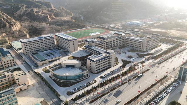 俯瞰建成投用的镇原县第一中学。学校占地7.4万平方米,建筑面积4.46万平方米,60个教学班可容纳3000名学生。主教学楼、实验楼、图书馆等设施一应俱全。