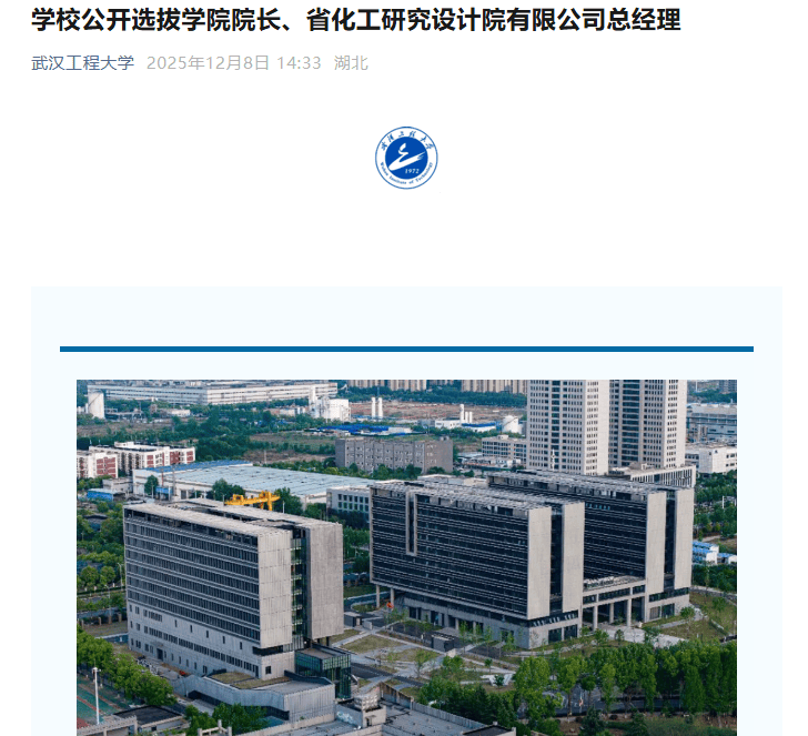 12月8日,武汉工程大学官网发布一则公告,公告称将面向校内外公开选拔学术水平高、管理经验丰富的学者担任二级学院院长、湖北省化工研究设计院有限公司总经理。