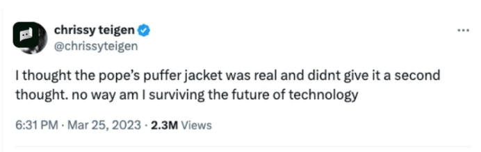 The revelation that they had been duppedleft some Twitter users shocked and confused."I thought the pope's puffer jacketwas real and didn't give it a second thought," tweeted model and author Chrissy Teigen. "No way am I surviving the future of technology."
