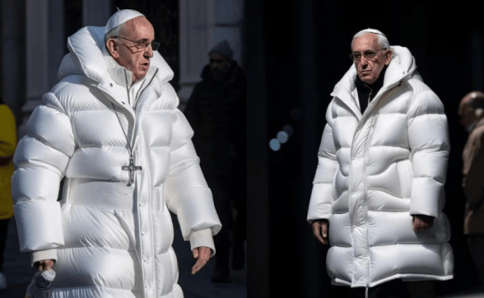 教皇方济各身着由奢华时尚品牌巴黎世家设计的白色长羽绒服在梵蒂冈外散步。不少网友信以为真,还感叹教皇的穿搭之时髦。
