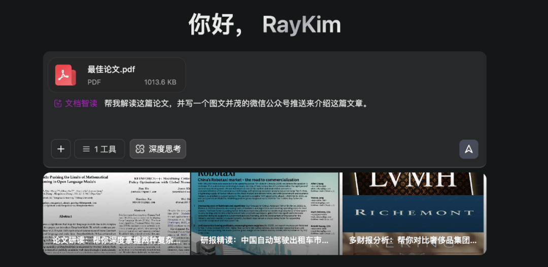 像刚才我们写公众号文章时,就选择了“文档智读”功能(会默认勾选“图像处理”工具)。