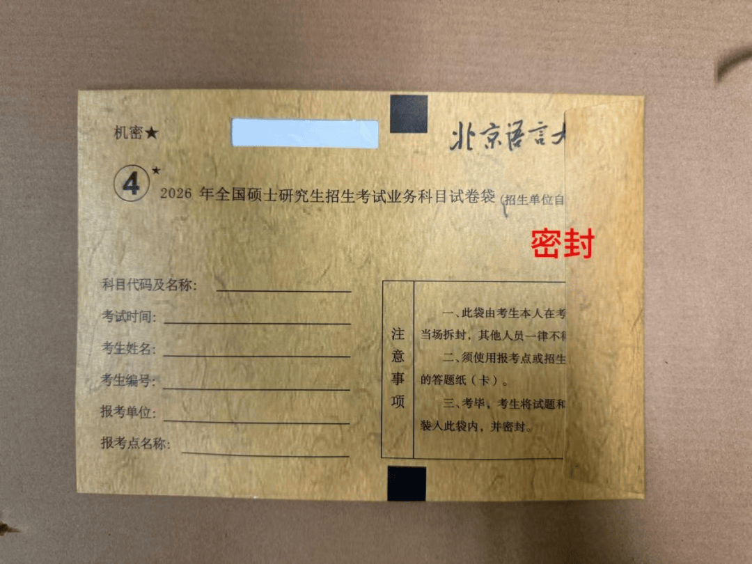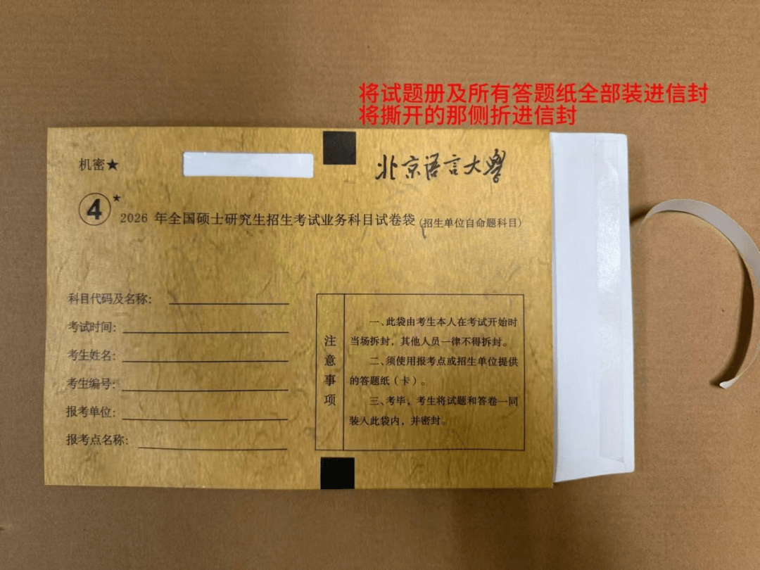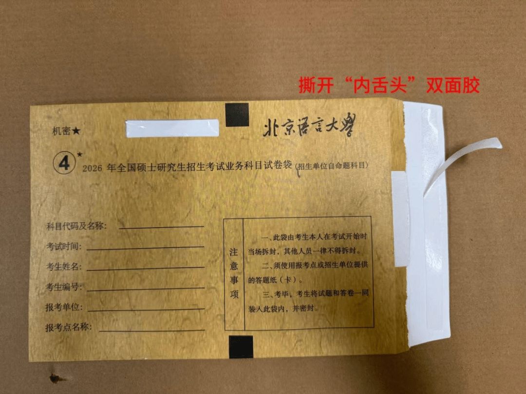 北京语言大学2026年硕士研究生招生考试自命题考试科目采用“双舌”易拉式试题信封,考生无需携带小刀和胶棒进入考场。