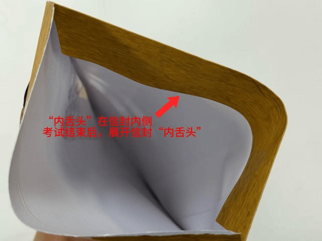 考试结束后,打开试卷信封,展开内侧的“内舌头”