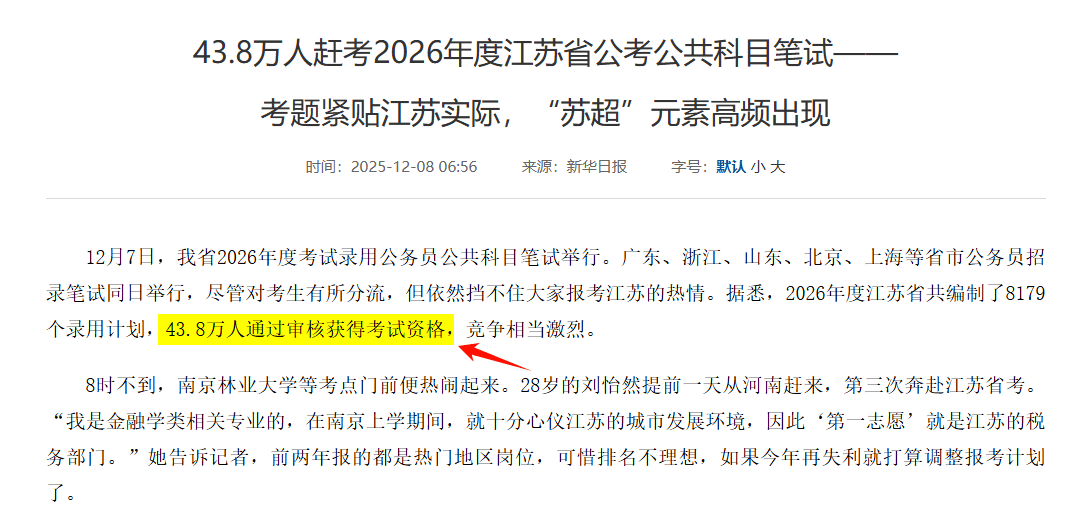 江苏省2026年共招录8179人,共有43.8万人通过审核获得考试资格。竞争约54:1。