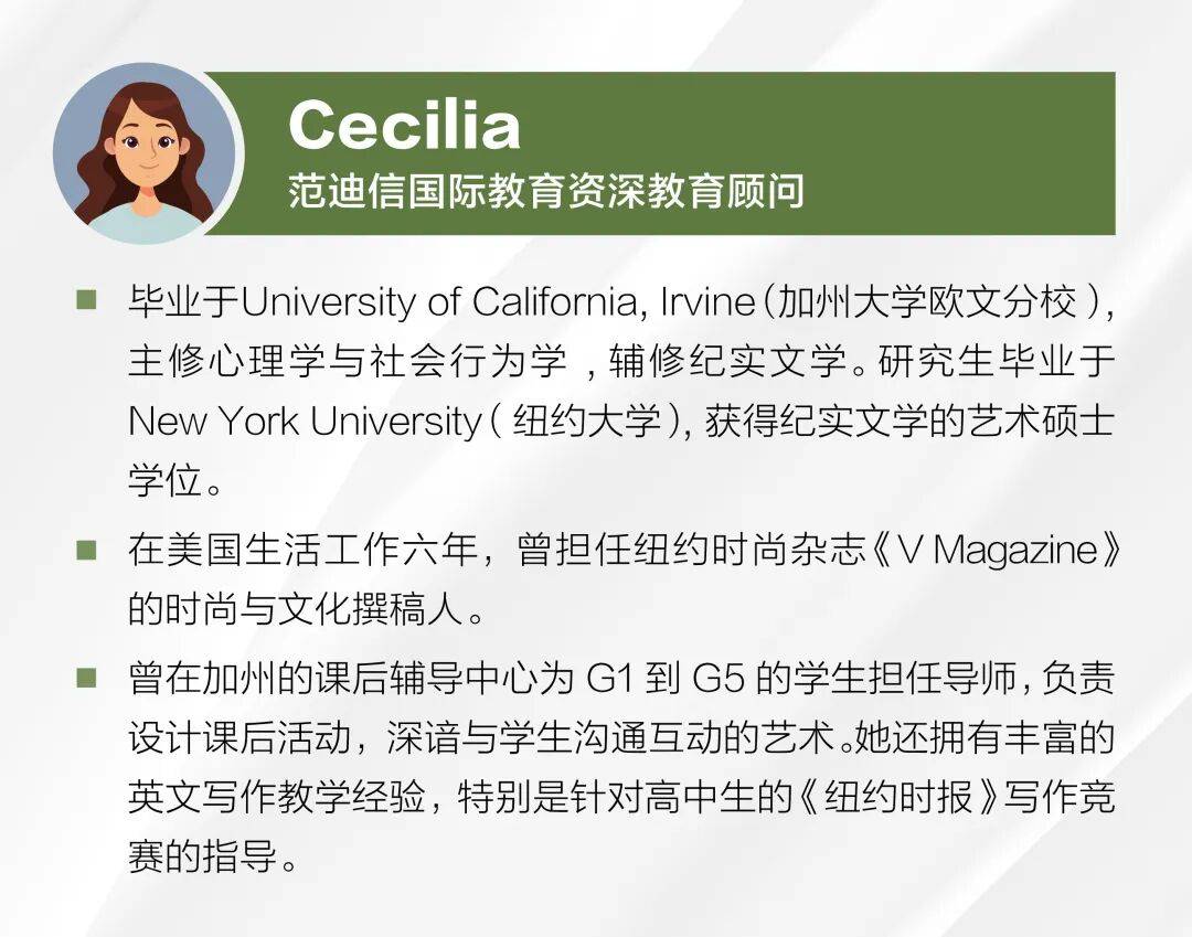 大家好,我是Cecilia。又一年的美高申请季悄然来临,这是一个充满期待也有些许紧张的季节。作为范迪信的资深顾问,我每年此时都会陪伴许多家庭走过这段重要的旅程,见证孩子们一步步接近梦想。在众多申请环节中,“面试”往往是最生动、也最考验应变能力的一环。