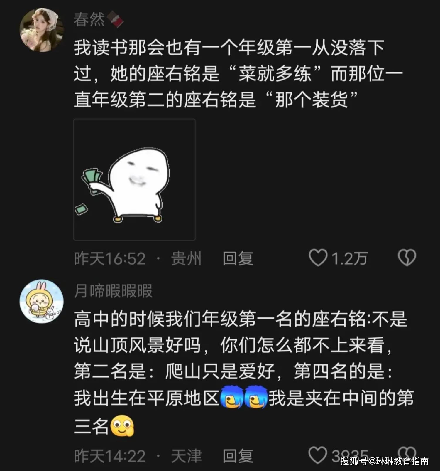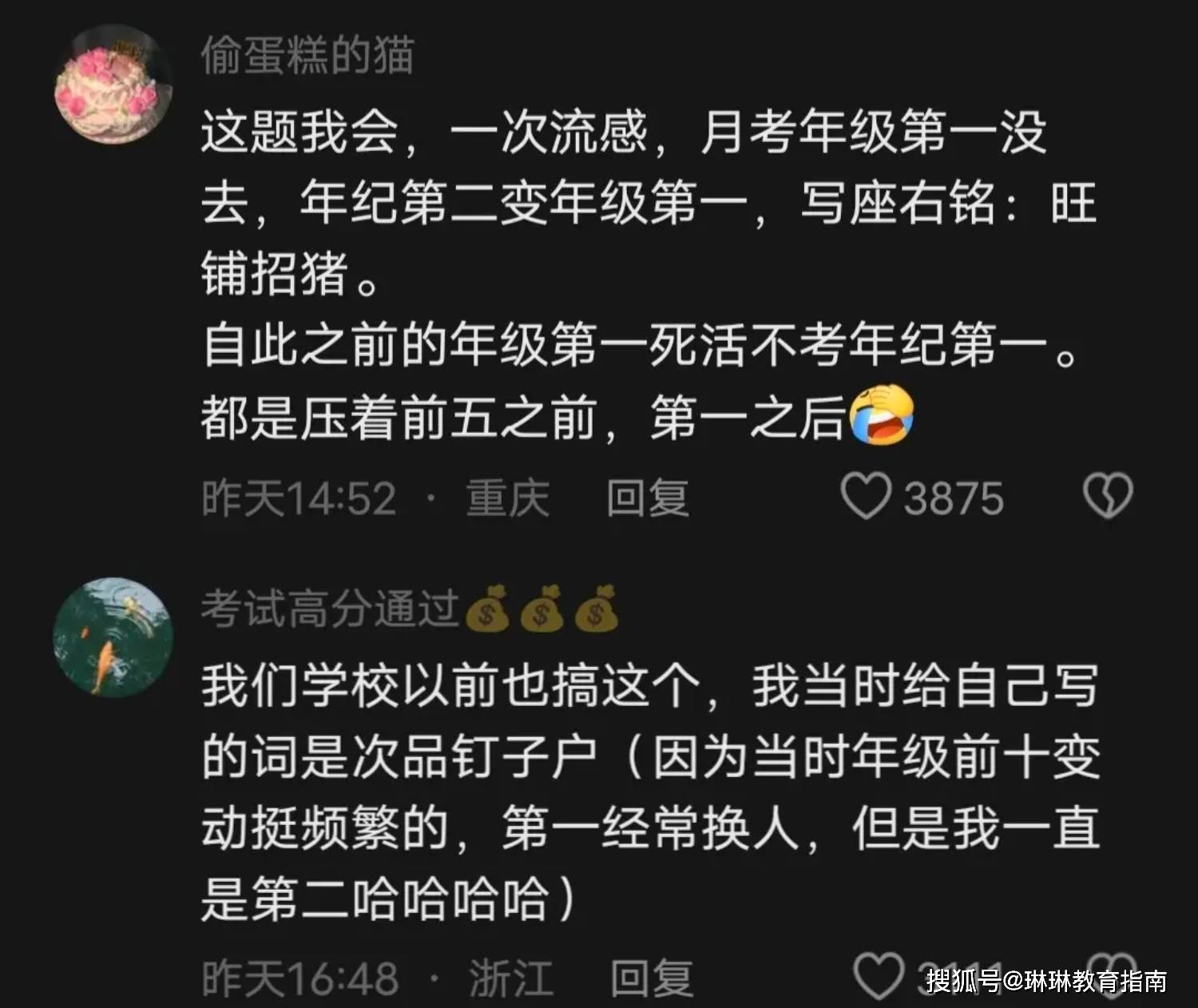 评论区一位00后同学吐槽自己学校的学霸:年级第一因为流感生病,月考没去,年级第二荣登年级第一的宝座,在光荣榜的座右铭上写了句“旺铺招猪”,一句谐音梗,直接把年级第一的道心给整破碎了。