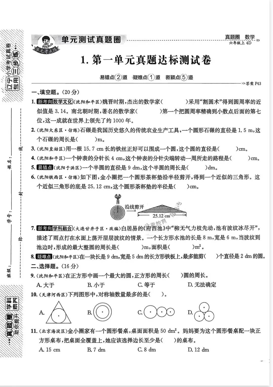 辽宁六年级家长必入!2025秋数学真题圈太香了 辽宁娃专属数学提分神器来啦✨ 2025秋辽宁省真题圈小学数学六年级上册,精准对标本地考点,闭眼入不踩雷! 金星教育出品,精选和平区、皇姑区、铁西区等重点学区真题,覆盖单元检测、期末综合全场景。每道题都标注疑难点、易错点,从基础夯实到思维提升层层递进,还有核心考点小卷和素养提升卷,完美适配六年级上册分数乘除、圆的计算、百分数应用等核心知识点。 刷真题才是提分关键!吃透本地考题套路,孩子做题有思路,家长辅导更省心📈 辽宁六年级数学冲高分,这套真题圈必须安排上~