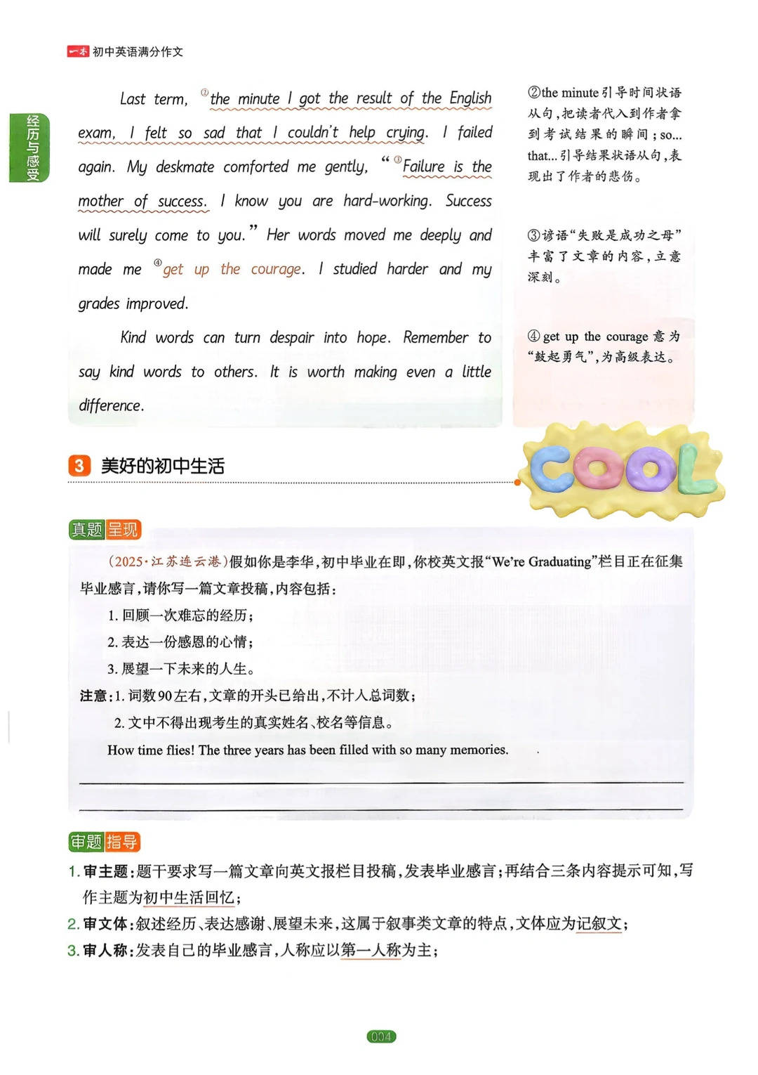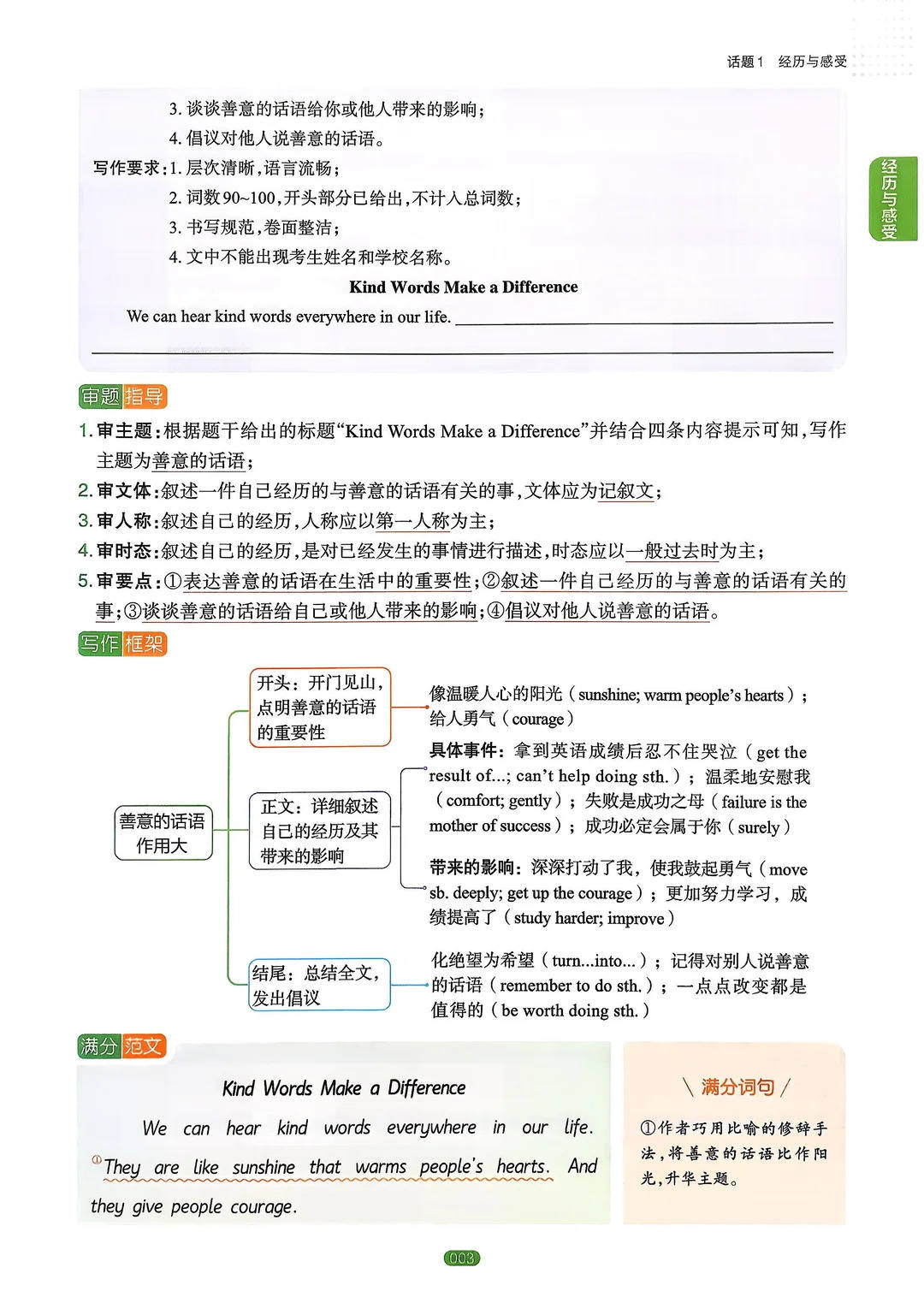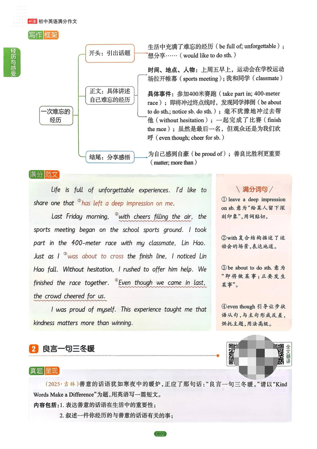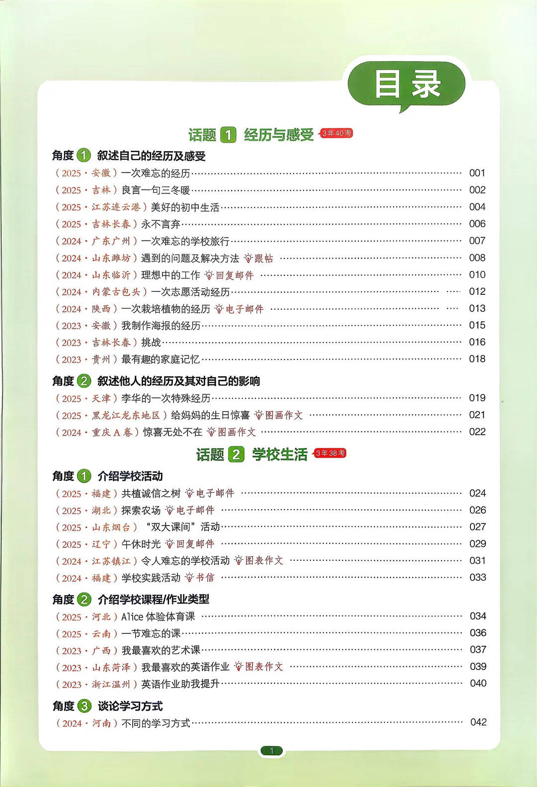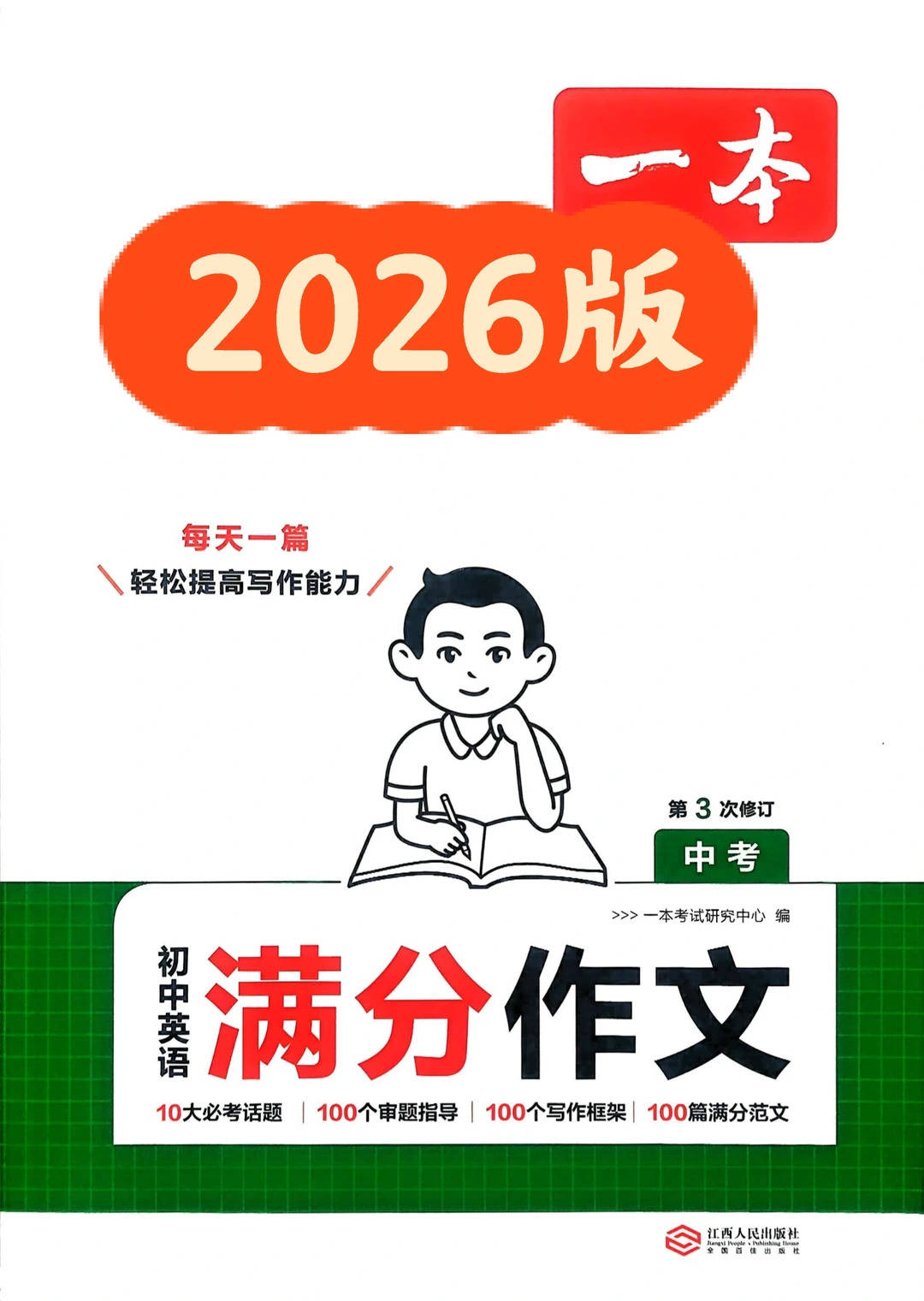 2026 版初中英语满分作文资料直接把 “中考写作密码” 焊死!涵盖10 大必考话题(经历与感受 / 学校生活 / 传统文化等)、100 个审题指导、100 个写作框架、100 篇满分范文,连 “一次难忘的经历” 的开头 - 正文 - 结尾模板、高分词句(如 “leave a deep impression”)都精准拆解,从审题到写作出彩一站式拿捏!