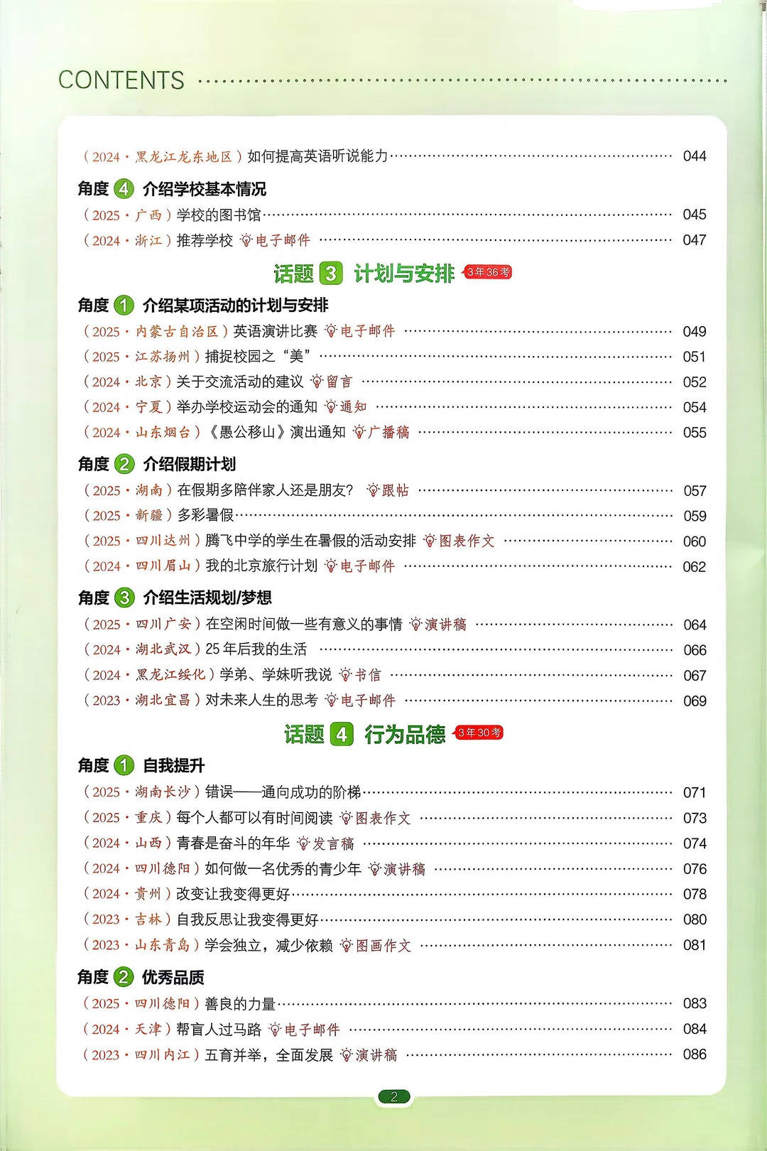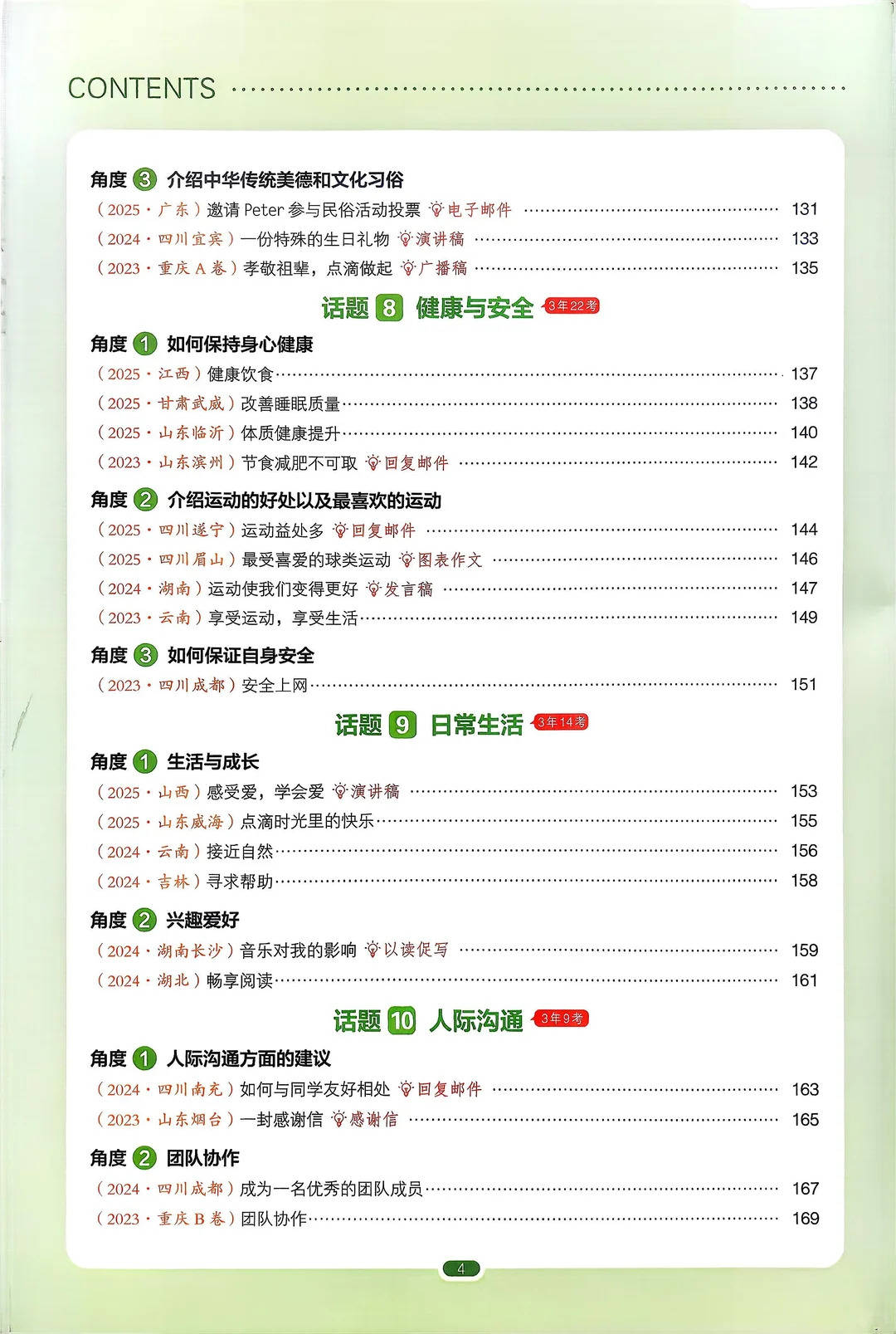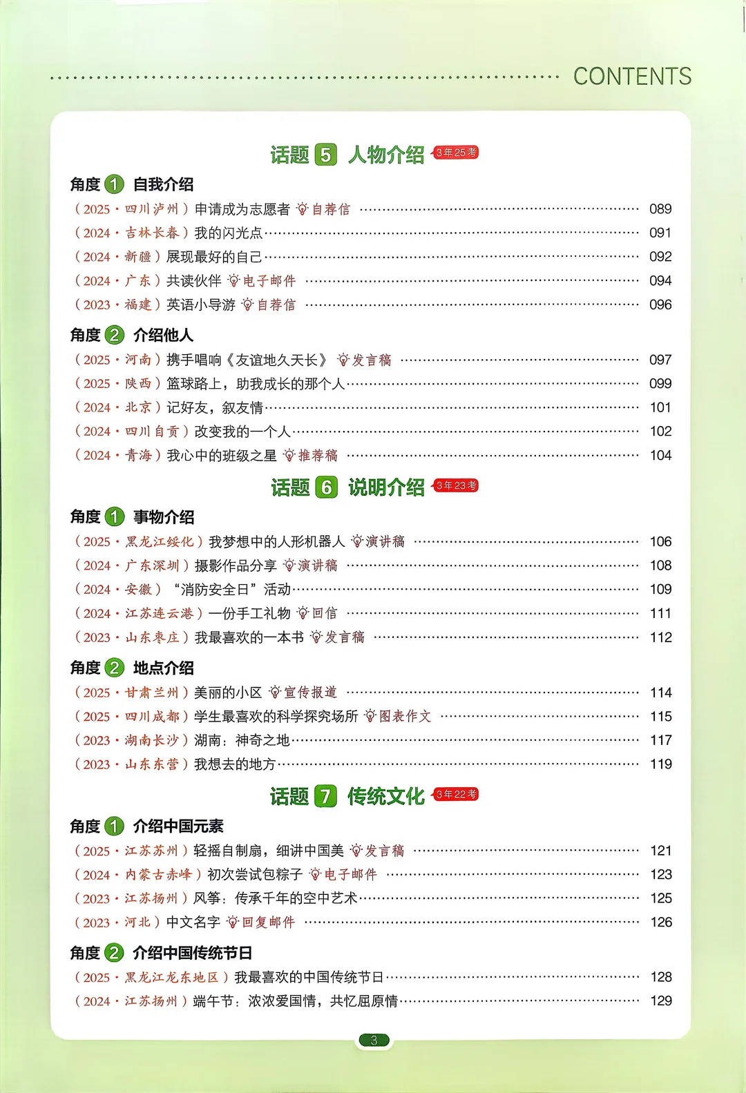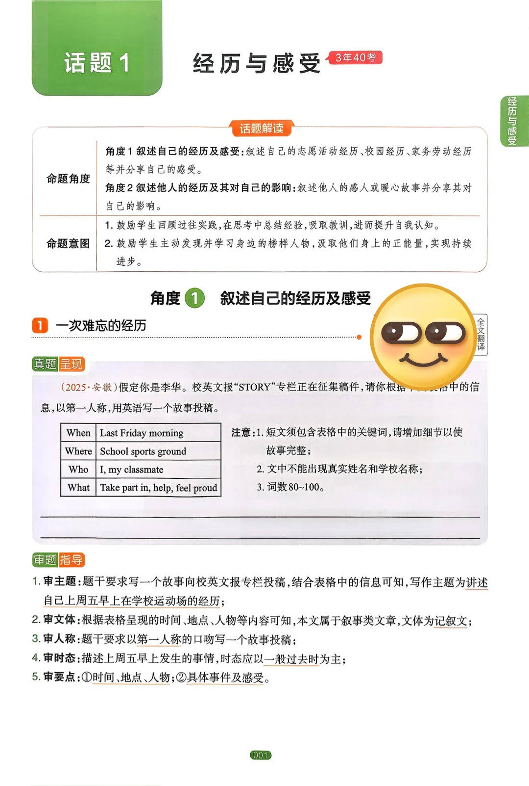 首先是适配中考 “话题聚焦 + 模板提分” 的核心需求—— 中考英语写作以固定话题(如经历、校园、传统文化)为主,这份资料把 10 大必考话题拆成 “角度 + 真题”,比如 “经历与感受” 对应 2025 安徽 / 吉林真题,既贴合中考命题趋势,又通过 “写作框架”(开头引话题 + 正文述事件 + 结尾谈感悟)给出生成逻辑,避免 “审题偏题、结构混乱” 的问题。