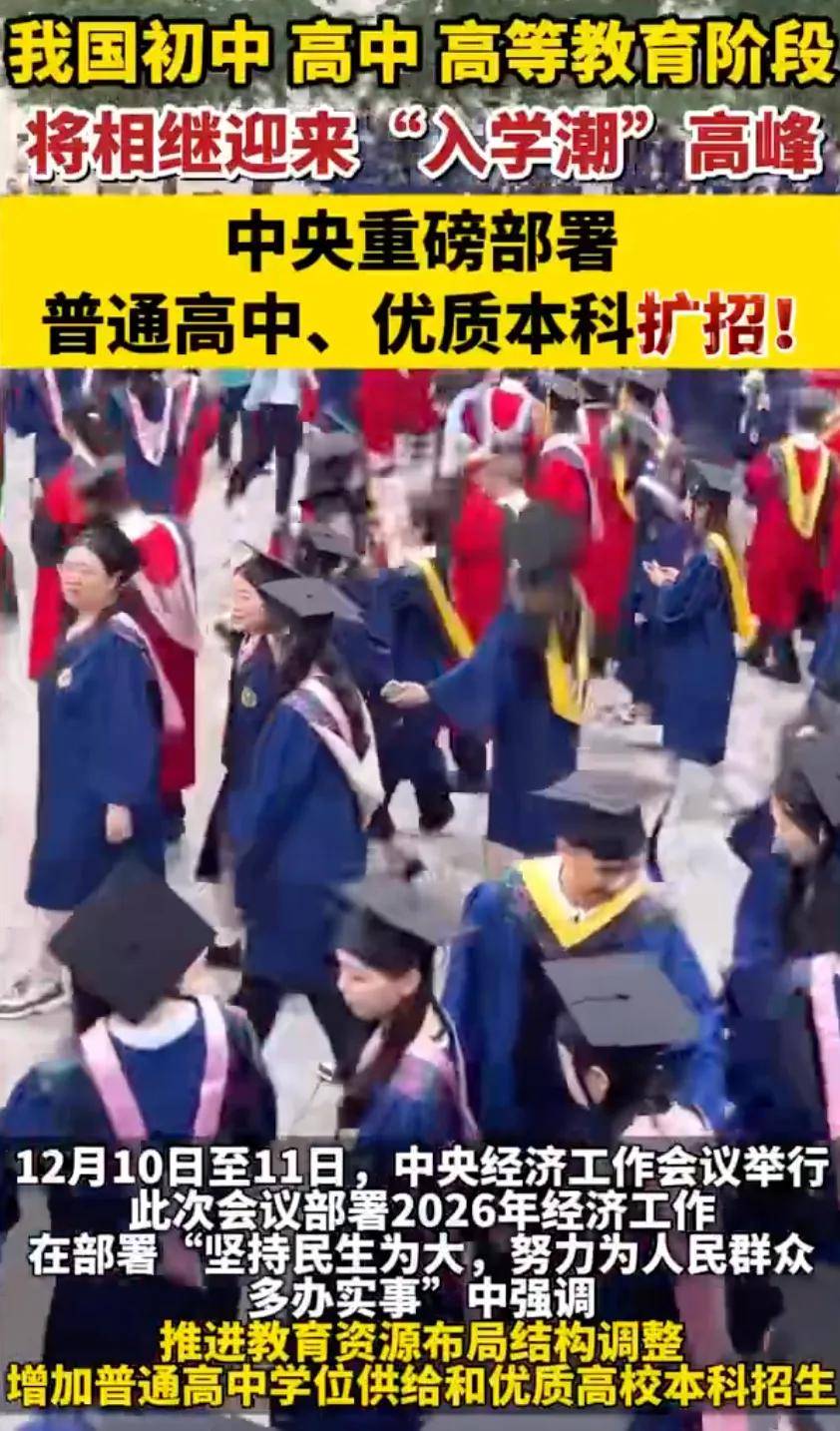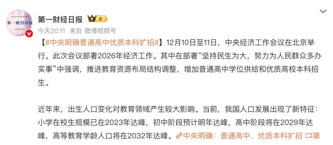 中央明确普通高中优质本科扩招,首次将“增加普通高中学位供给和优质高校本科招生”纳入重点民生实事,直接回应人口结构剧变与教育公平两大社会痛点。那么为何普通高中优质本科要扩招?主要是出生人口变化对教育产生影响,小学在校生规模已在2023年达峰,初中阶段预计明年达峰,高中阶段将在2029年达峰,高等教育学龄人口将在2032年达峰。