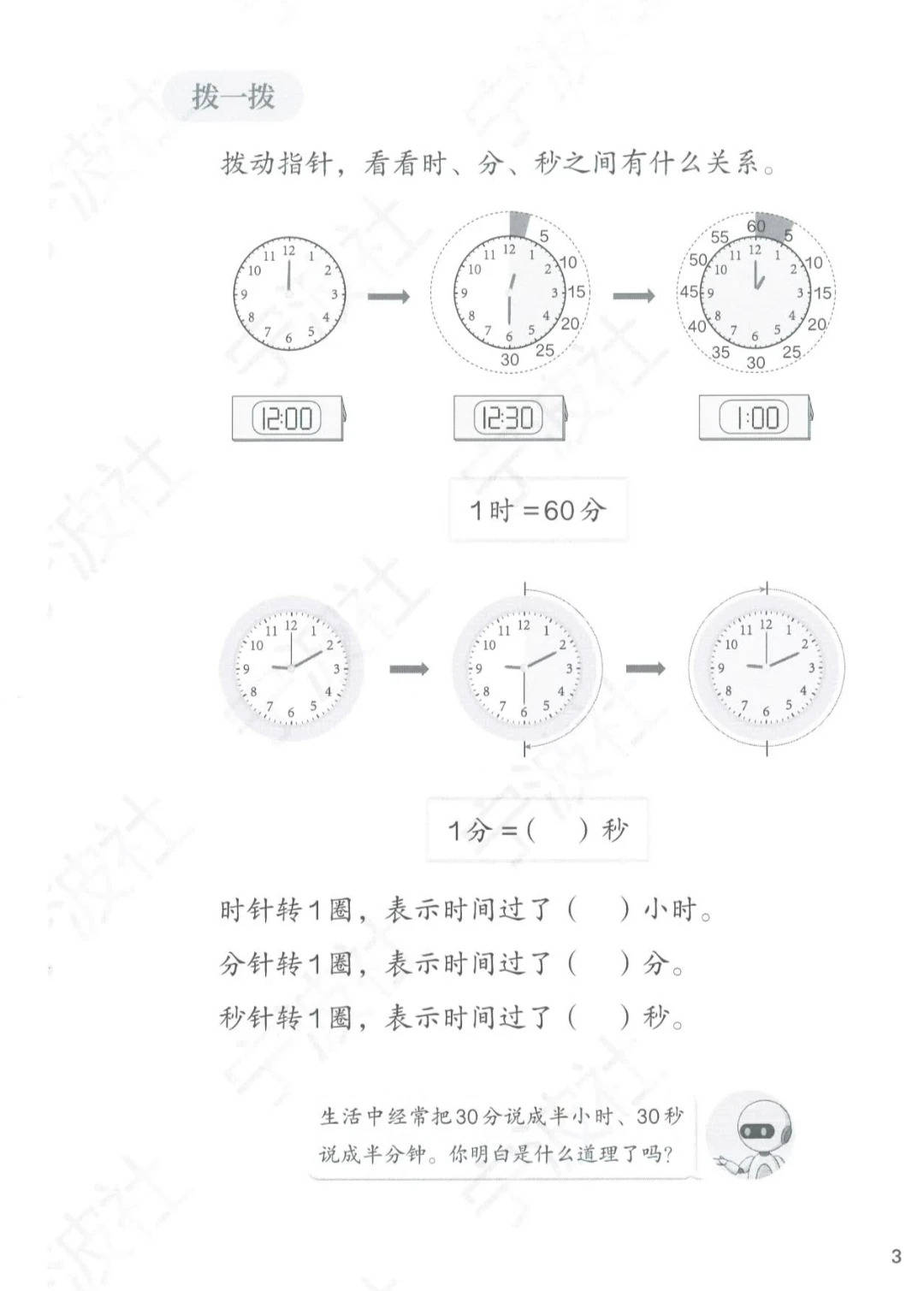 其次是设计踩中二年级 “趣味 + 实践” 的认知特点—— 二年级娃怕 “枯燥概念”,课本把 “学习” 做成 “互动任务”:把 “时 / 分 / 秒关系” 变成 “拨指针探究”,把 “时间感知” 转化为 “闭眼估 30 秒” 的游戏,学习像 “玩生活小游戏”,完全不抵触;“观察 + 操作 + 实践” 的模式,还能帮孩子快速建立 “时间单位→生活体验” 的关联,效率直接拉满。