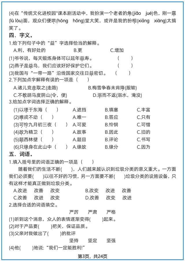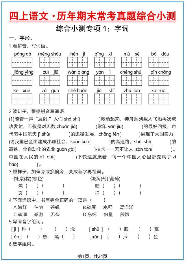 四上家长别再愁找真题!孩子期末复习最怕练的题脱离考情,刷了不少却抓不住核心考点。这套四上语文历年期末常考真题综合小测太实用了!精选八套历年高频真题,完全贴合四上语文期末考纲,覆盖字词运用、阅读理解、病句修改、习作表达等全题型。31页内容排版清晰,每套小测都标注常考频次,帮孩子快速锁定重点;