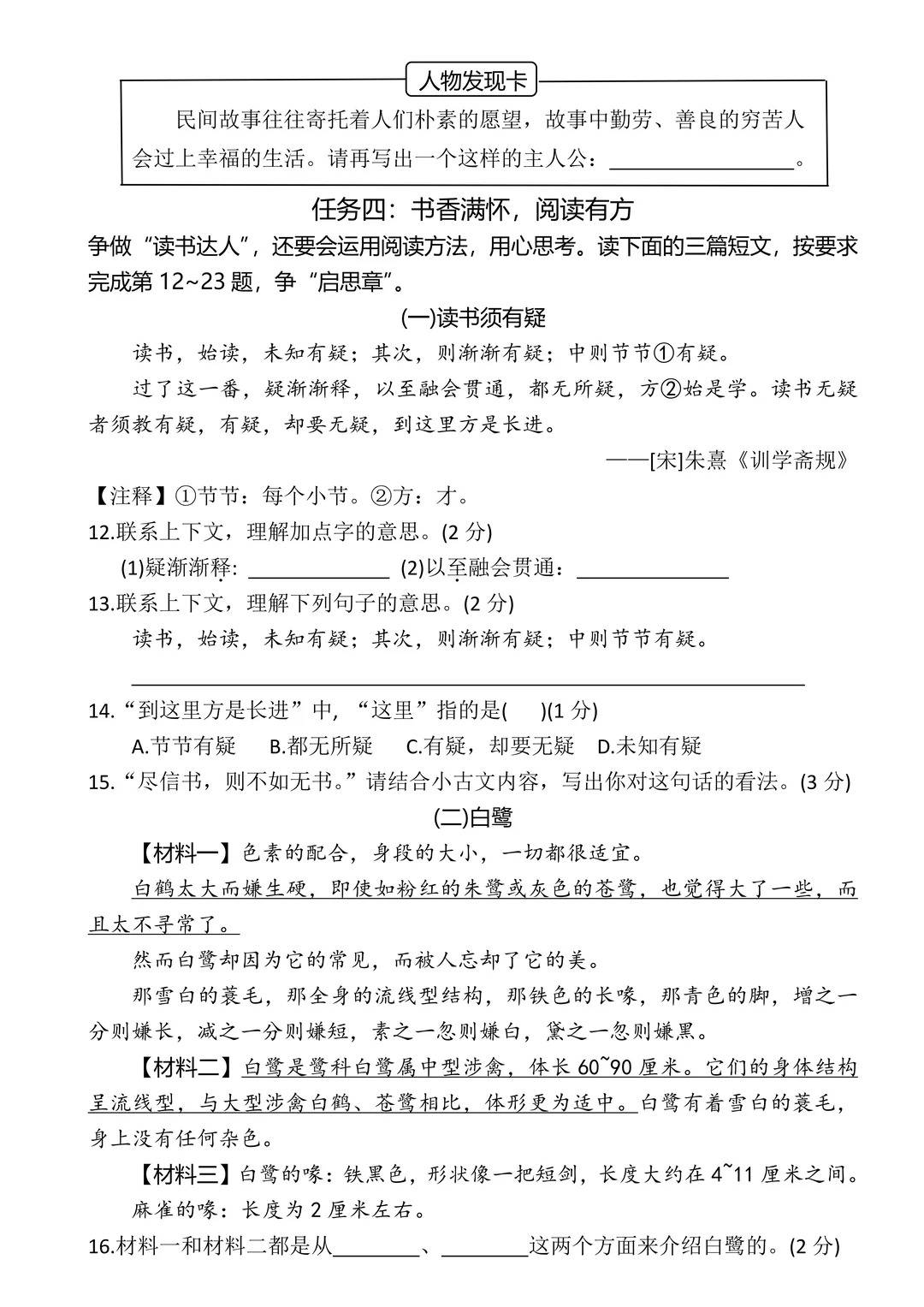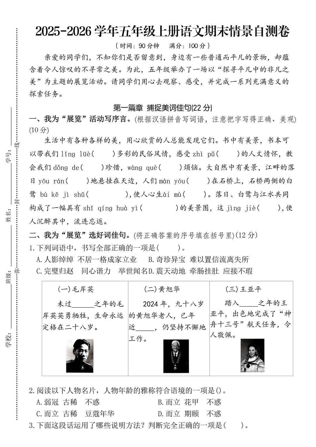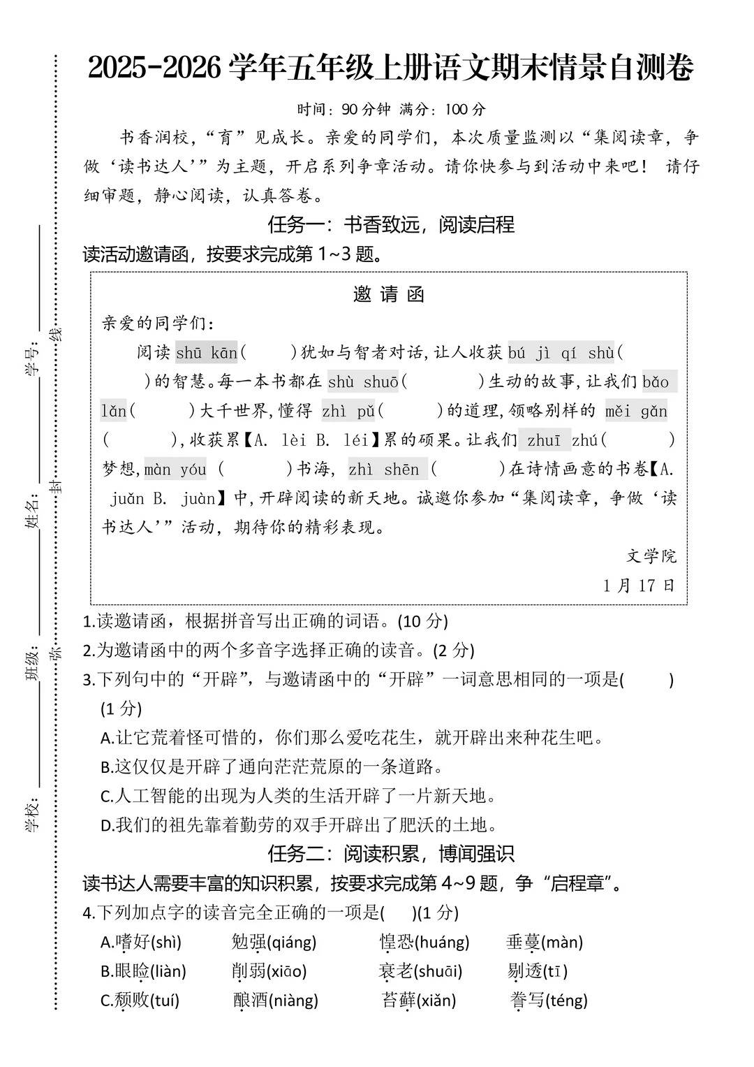 五年级上册语文期末情境试卷(含答案)电子版可打印
