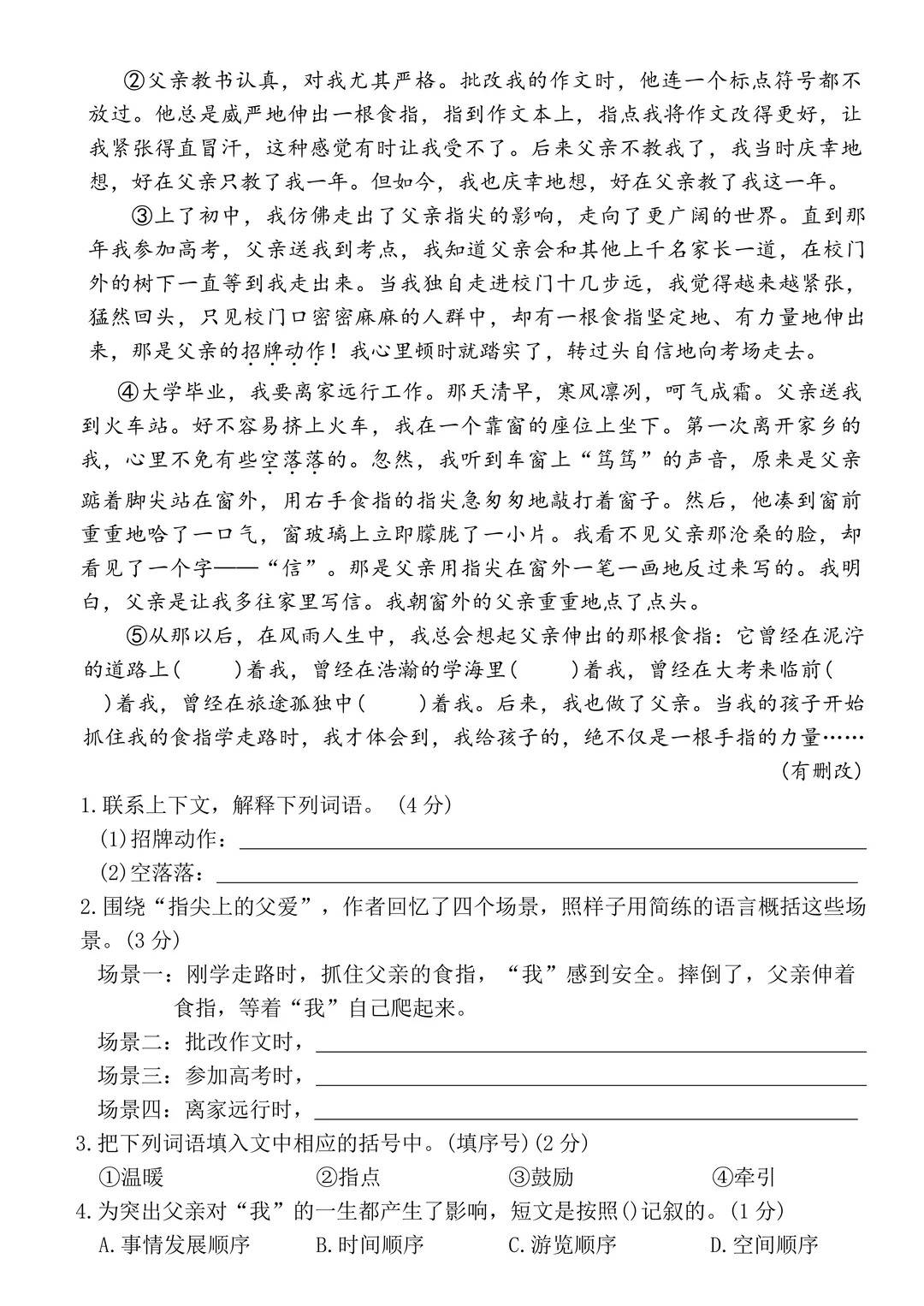 其次是设计踩中五年级 “思辨 + 表达” 的认知特点—— 五年级娃怕 “语文考试枯燥”,试卷把 “考查” 做成 “探究任务”:把 “词语辨析” 变成 “为展览选好词”,把 “阅读题” 转化为 “分析父爱场景”,答题像 “完成趣味探究”,完全不抵触;“基础 + 阅读 + 写作” 的闭环模式,还能帮孩子快速建立 “积累→理解→表达” 的关联,效率直接拉满。