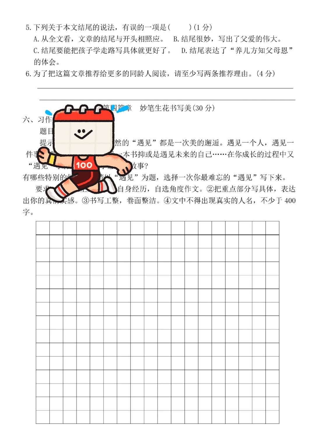 五年级上册语文期末自测卷直接把 “考试” 做成 “主题探究活动”!涵盖字词书写、词语辨析、说明方法判断、阅读理解(父爱主题)、习作(“遇见” 为题),连 “一词多义造句”“美句仿写”“文章推荐理由” 都配了情境任务,从基础积累到读写应用一站式拿捏!