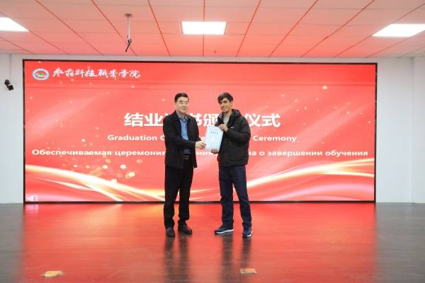 12月12日上午,枣庄科技职业学院在图书馆卓越匠心文化体验中心举行2025届留学生结业仪式,热烈欢送塔吉克斯坦留学生顺利结业。学校党委副书记、院长闵祥寨,杭州电子科技大学原国际处处长、国际教育学院院长、港澳台主任田野教授、博士,学校党委委员、宣传部(信息处)部长马西柱,团委、学生工作处、教务处(科技处)、招生就业处主要负责人,文化与旅游学院班子成员参加仪式。任课教师参加仪式并为留学生送上诚挚的祝福,仪式由学校党委委员、副院长刘陵东主持。