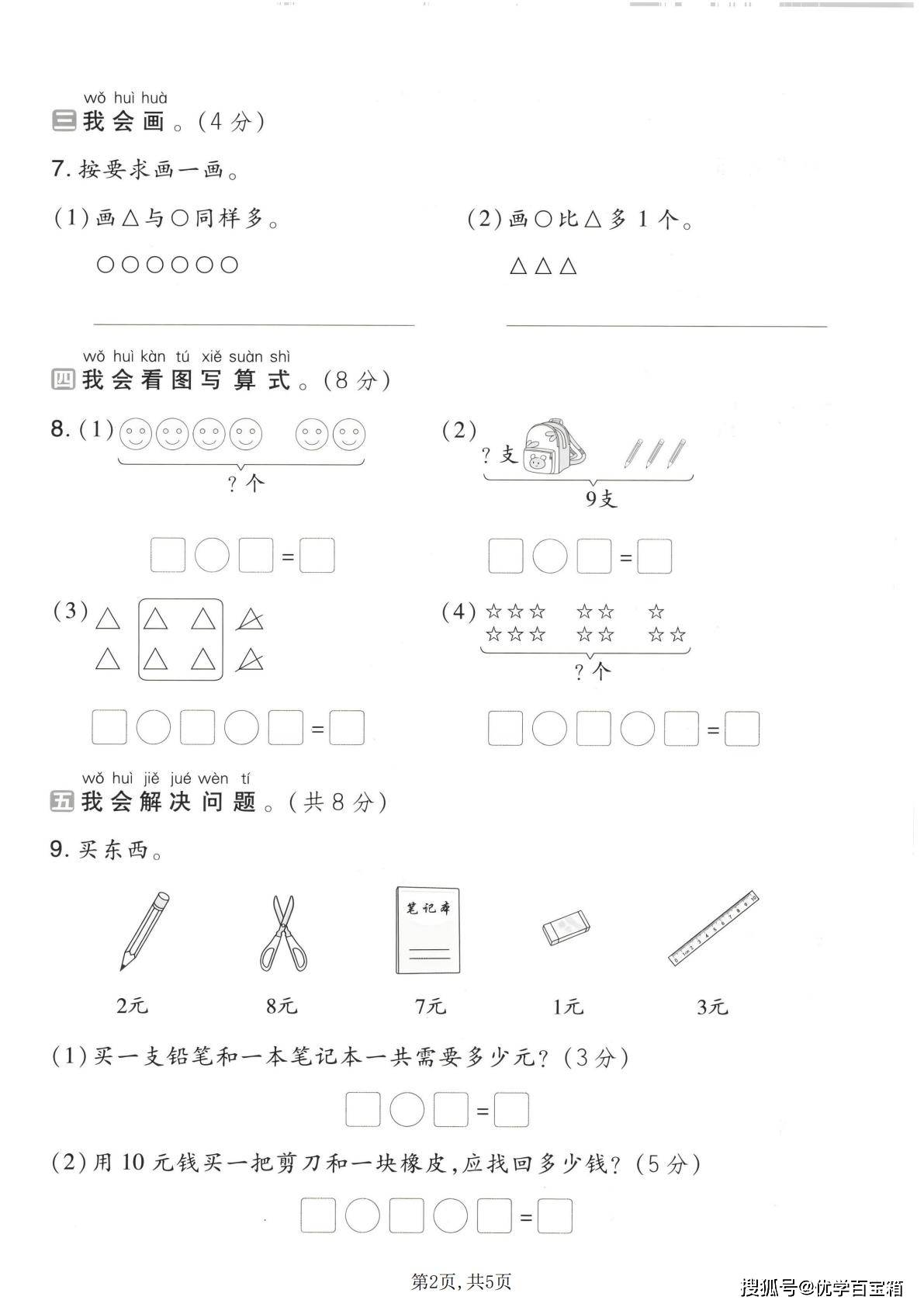 这份北师大版一年级上册数学质量检测卷,像一场 “数学能力分模块闯关”,把知识拆成 “数与代数”“图形与几何”“统计与概率” 三个清晰板块:“数与代数” 是核心运算场,从看图写数、规律填数,到加减运算、情境列式,把 10 以内数的认识与运算裹在具象题目里;“图形与几何” 是空间感知站,通过组合图形稳不稳、立体图形计数,练的是图形特征的认知;“统计与概率” 则是分类思维的小练习,让学生用数学方法给物品归类。