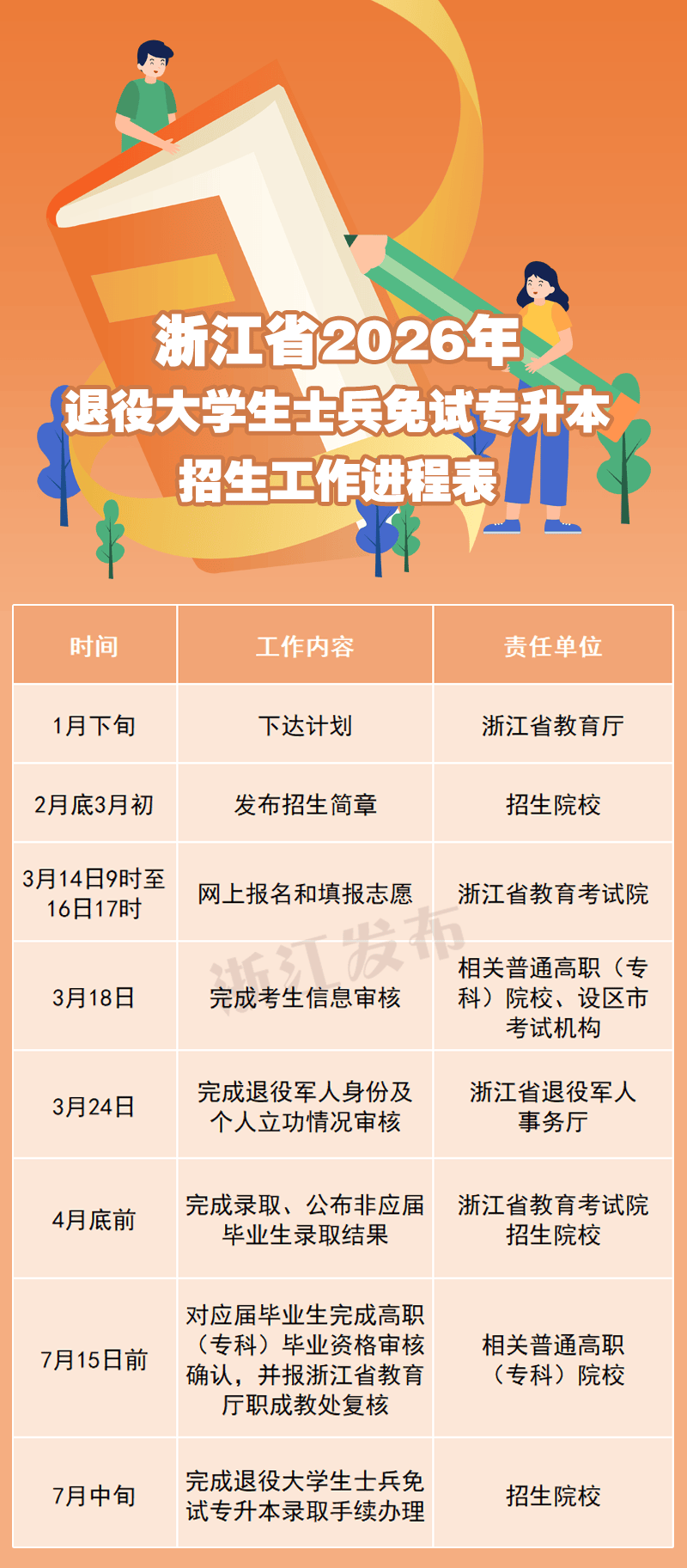 近日,省教育厅办公室、省退役军人事务厅办公室印发《浙江省2026年退役大学生士兵免试专升本招生工作实施办法》。3月14日起,符合条件的考生可办理网上报名和志愿填报。