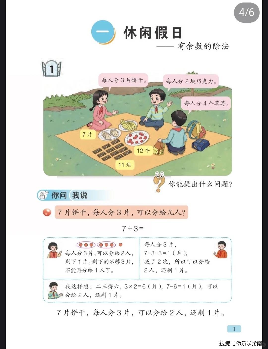 这套教材的设计贴合二年级学生的认知水平,每单元都以生活场景导入,比如 “休闲假日” 的野餐场景、“游览北京” 的文化之旅,能快速激发学生的学习兴趣。同时,教材通过 “你问我说”“动手分一分” 等互动环节,让学生在操作中理解数学规律,比如有余数除法的 “余数小于除数” 规则,通过分草莓的实践自然得出。此外,“智慧广场” 和 “主题活动” 模块,如数学连环画、时间与生活实践,能进一步提升学生的综合素养,让他们在趣味中培养数学思维。