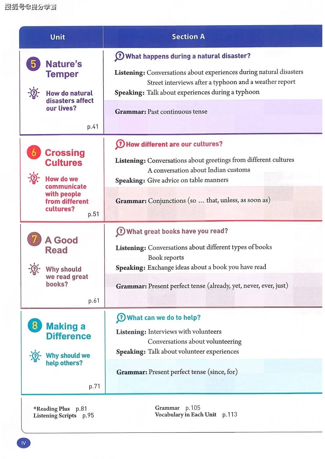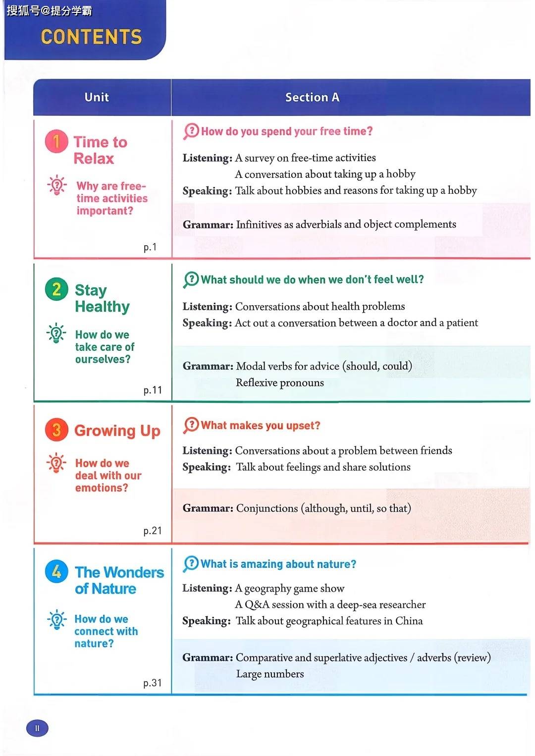每个单元聚焦对应的语法重点,如不定式结构、比较级与最高级、过去进行时等,将语言知识与成长议题紧密结合,实现 “学语言” 与 “学成长” 的双重目标。
