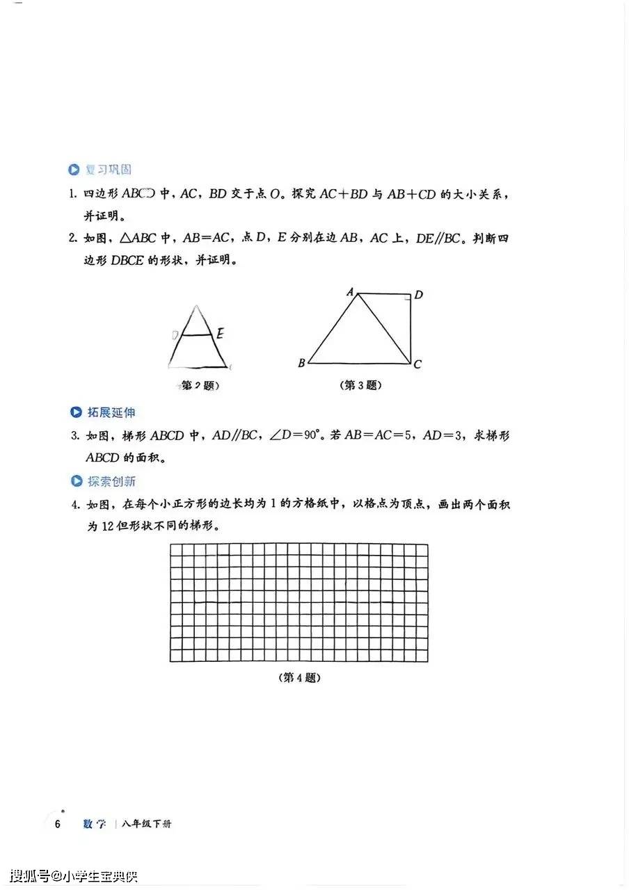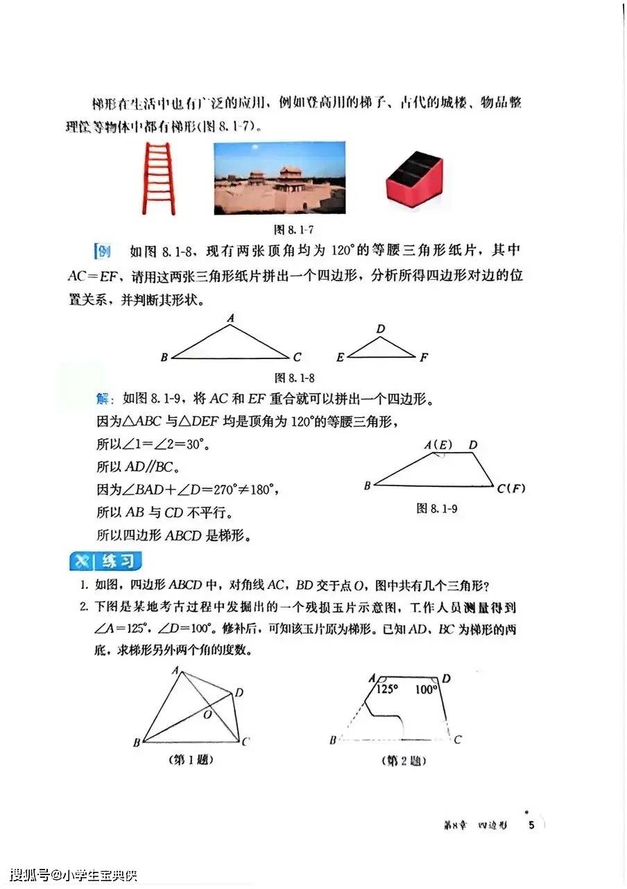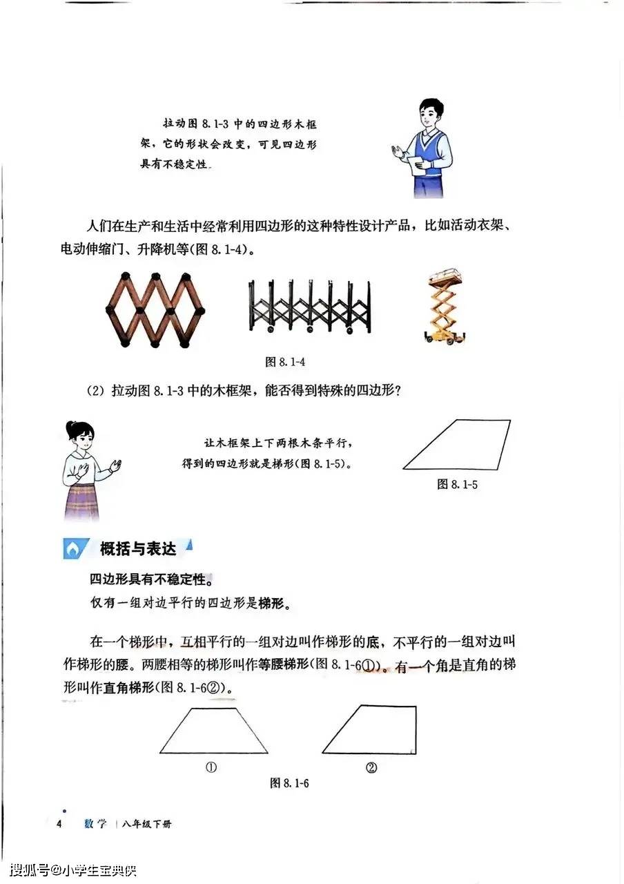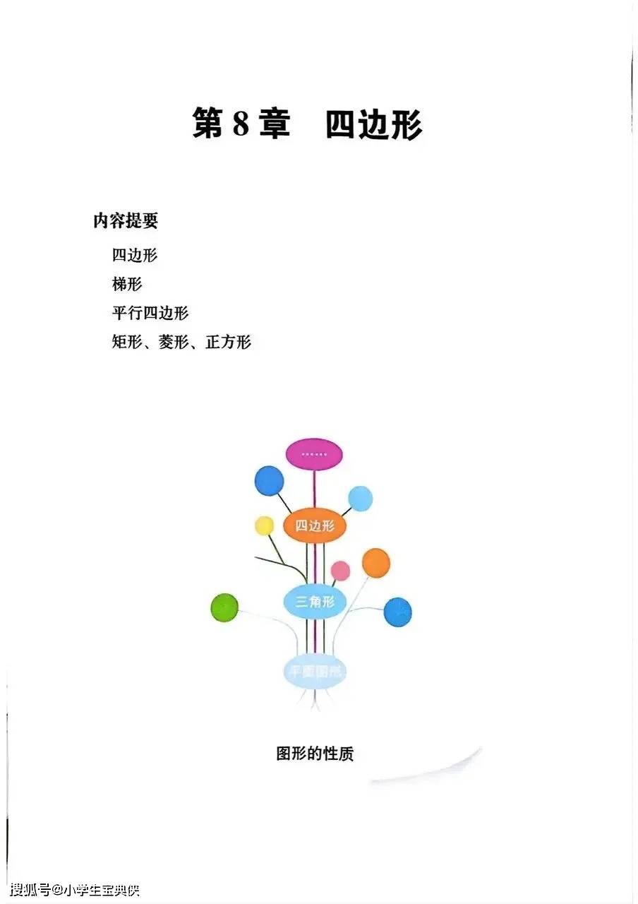 教材开篇以 “四边形” 为核心,从生活中常见的建筑外观、书本纸张等实例切入,引导学生认识四边形的定义、内角和及不稳定性等基础性质。随后深入探究平行四边形、矩形、菱形、正方形等特殊四边形的性质与判定,通过 “木框拉动”“图形拼接” 等实践操作,让学生直观理解各类图形的演变关系,掌握 “将四边形问题转化为三角形问题” 的解题思想。例如,在探究平行四边形性质时,通过对角线分割成全等三角形的推导,深化对几何转化方法的理解,为后续复杂几何证明奠定基础。