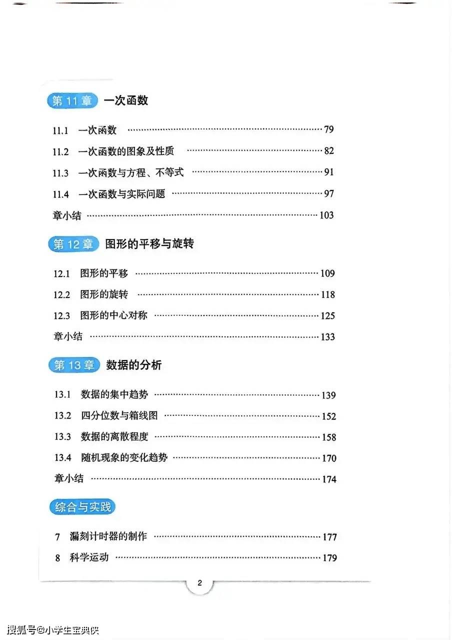 教材还融入了 “图形的平移与旋转”“数据的分析” 等拓展模块,进一步完善知识体系。平移、旋转与中心对称的学习,让学生掌握图形变换的规律,提升空间想象能力;数据的分析则通过平均数、四分位数、离散程度等统计量的学习,培养学生的数据分析与决策能力。“漏刻计时器的制作”“科学运动” 等综合实践活动,更将数学知识与生活场景深度绑定,让学生在实践中深化理解。整册教材从几何探究到代数运算,从基础概念到实践应用,既贴合中考考纲要求,又注重思维能力的全方位提升,是八年级学生突破数学瓶颈、迈向高阶学习的重要阶梯。