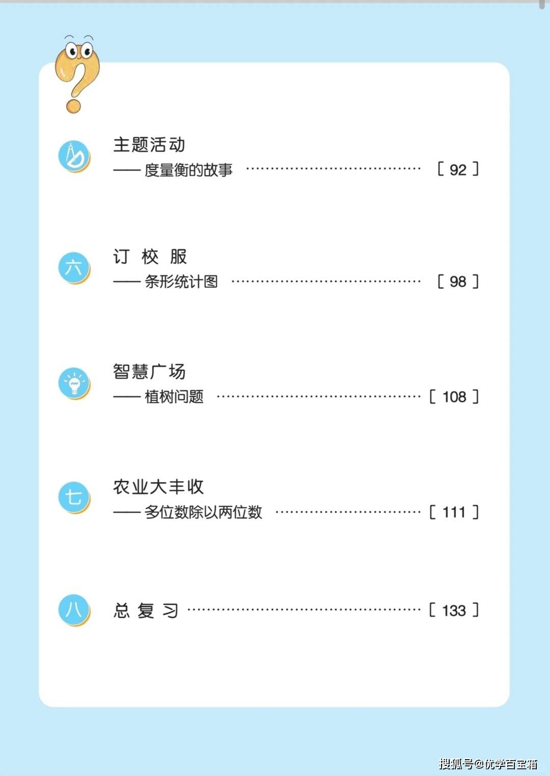 在数与代数领域,“大数知多少” 单元带领学生认识万以上的数,包括数的读写、大小比较与改写,补充近似数的求解方法,强化数感;“农业大丰收” 单元则聚焦多位数除以两位数的运算,从笔算方法到实际应用,提升学生的运算能力。此外,教材还融入了 “年、月、日的秘密”“度量衡的故事” 等主题活动,以及 “条形统计图”“植树问题” 等拓展模块,进一步完善知识体系。