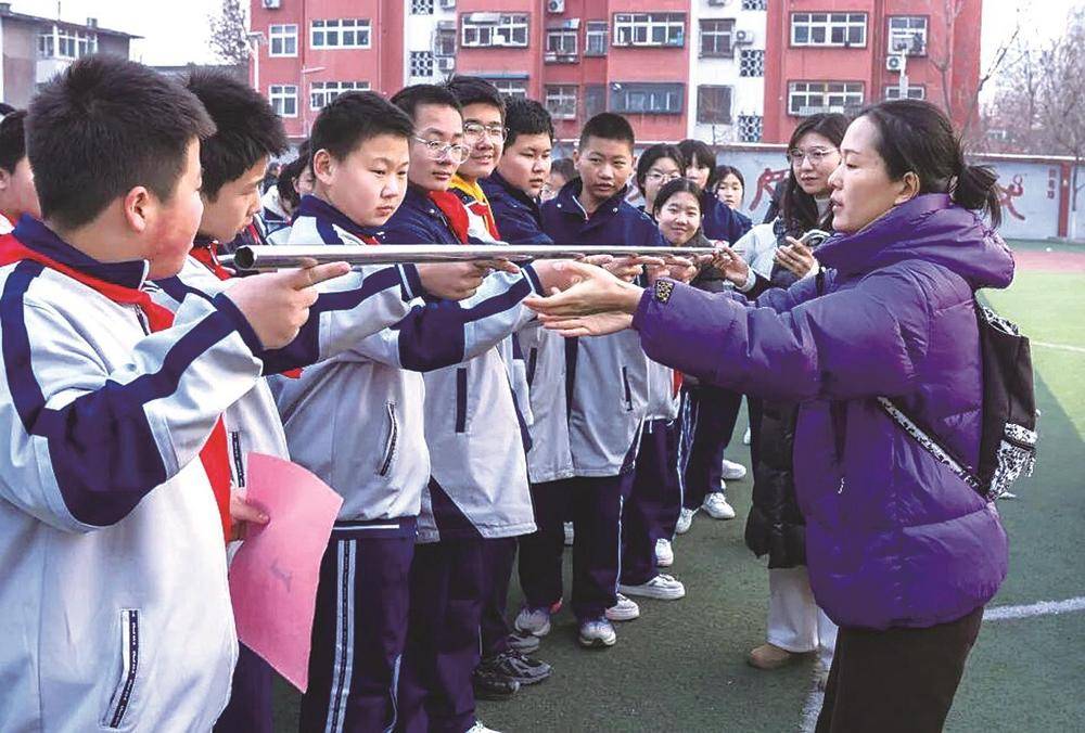 活动从户外体验环节开始。各班同学分组协作,仅用食指共同托起一根指挥棒,在不发出声音的情况下,将其平稳降至地面。过程中,大家神情专注、配合默契,通过一次次眼神交流和动作调整,共同体会到:有效沟通不仅依靠语言,更在于心灵的默契与行动的协调。