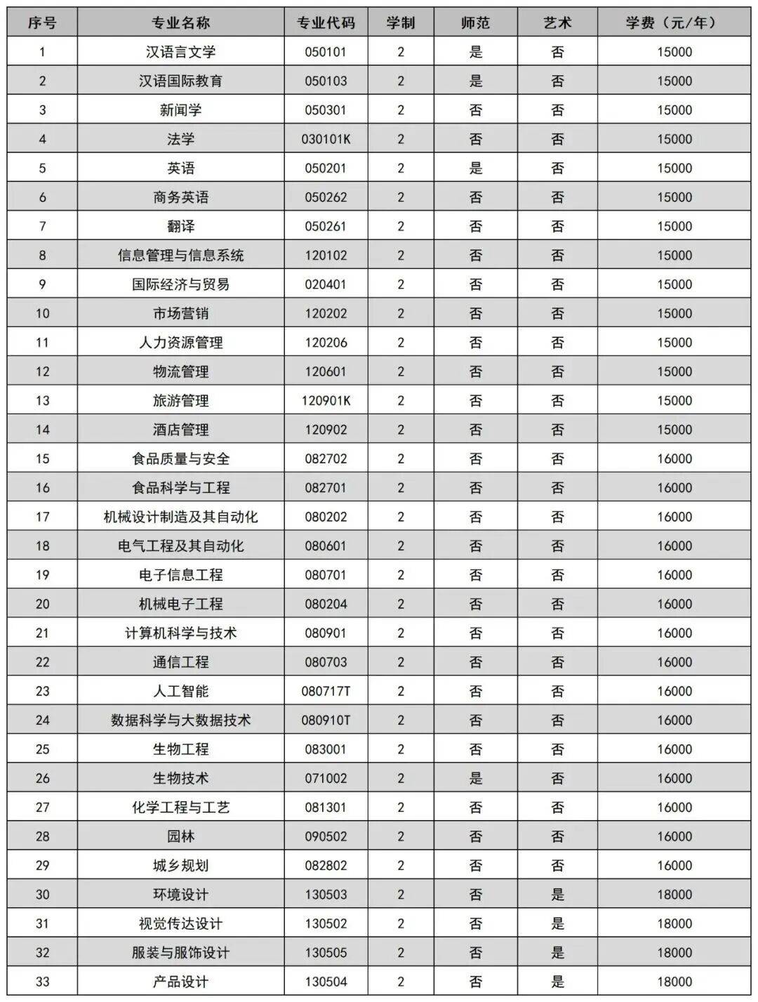 学费:汉语国际教育(师范)、汉语言文学(师范)、新闻学、法学、商务英语、英语(师范)、翻译、国际经济与贸易、市场营销、信息管理与信息系统、人力资源管理、物流管理、酒店管理、旅游管理专业15000元/生·年;食品质量与安全、食品科学与工程、电气工程及其自动化、电子信息工程、机械设计制造及其自动化、机械电子工程、计算机科学与技术、通信工程、人工智能、数据科学与大数据技术、化学工程与工艺、园林、城乡规划、生物技术(师范)、生物工程专业16000元/生·年;视觉传达设计、环境设计、服装与服饰设计、产品设计专业18000元/生·年;