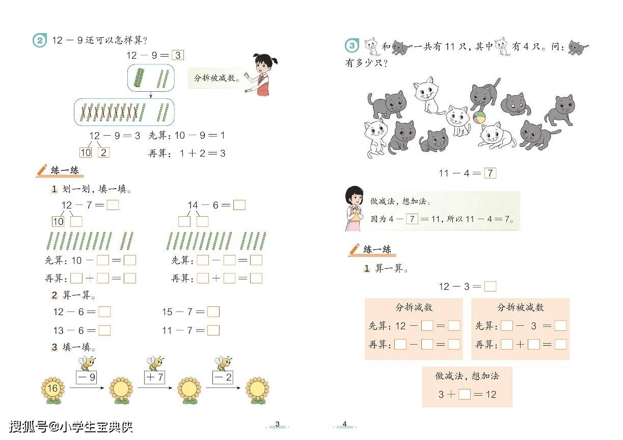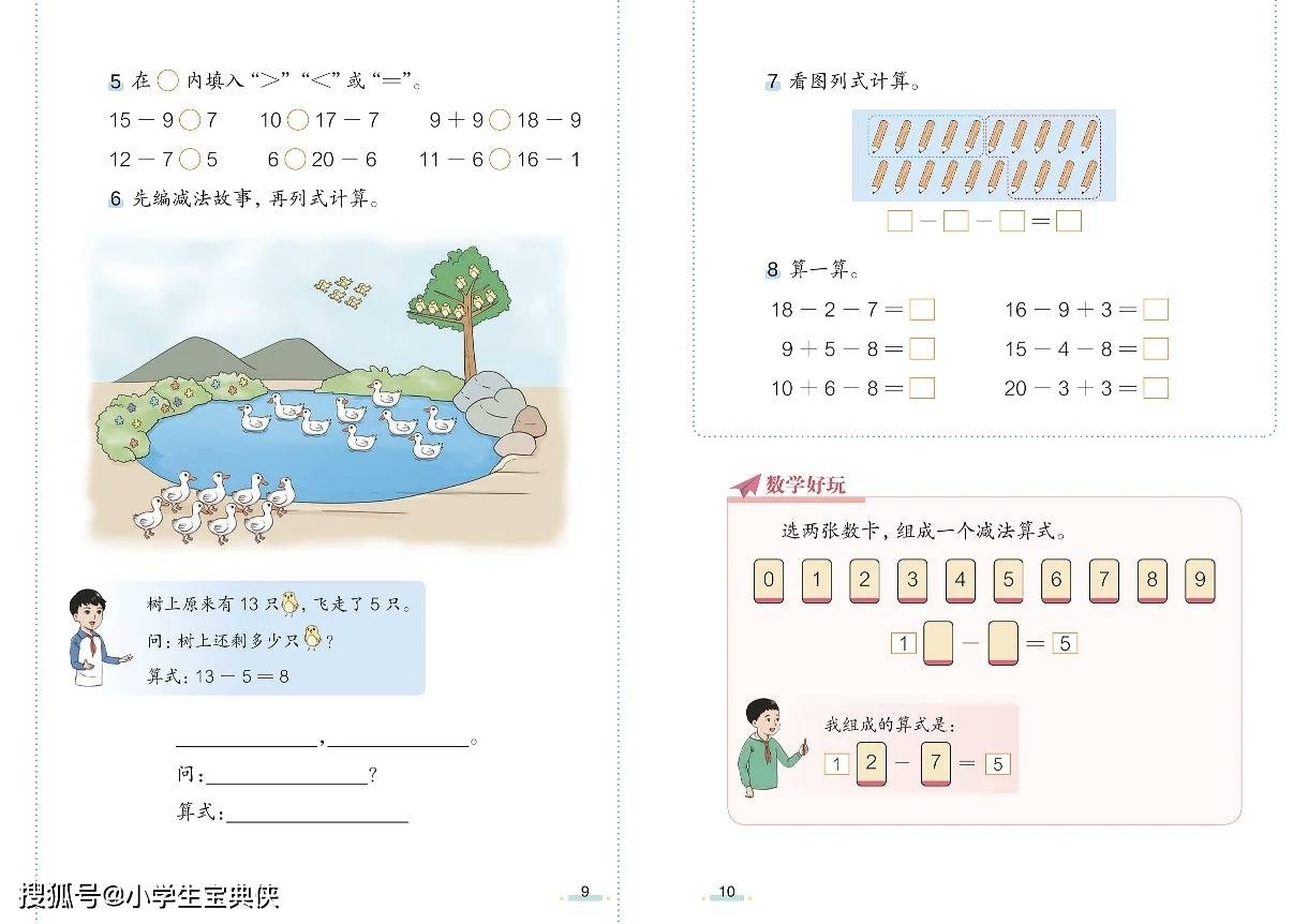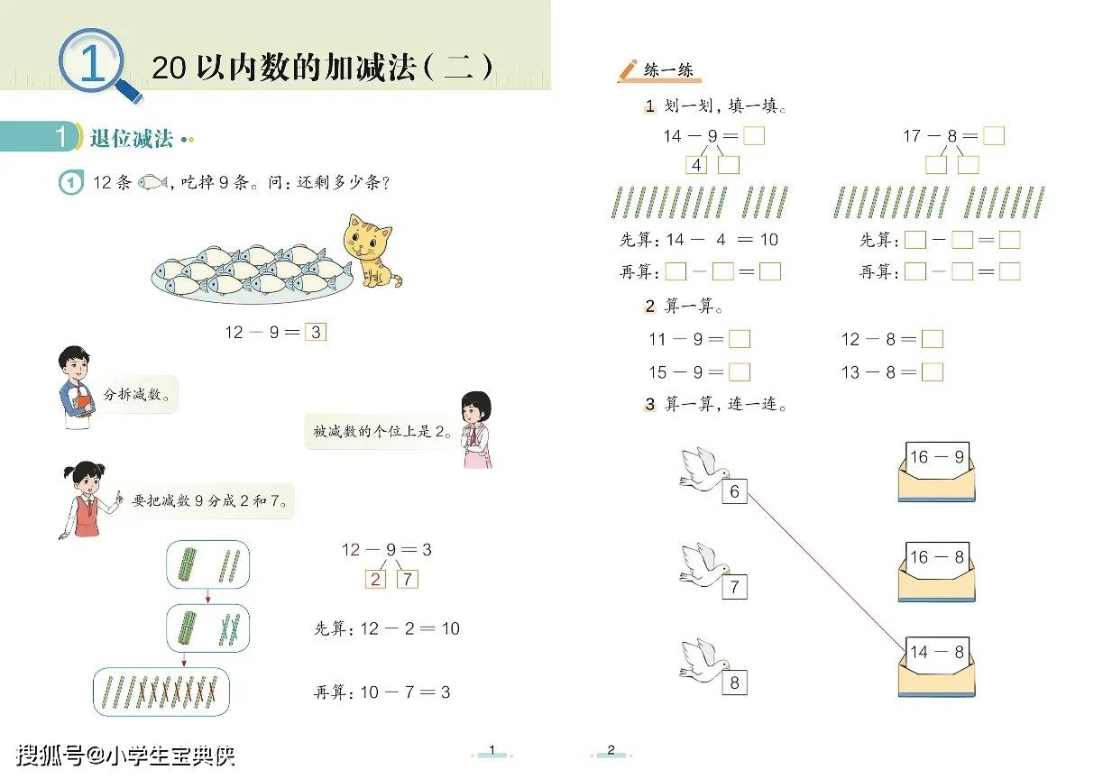 教材开篇聚焦 “20 以内数的加减法(二)”,通过小猫吃鱼、动物数量统计等生活场景,引入退位减法的学习。学生将掌握分拆减数、分拆被减数、做减法想加法三种计算方法,如计算 12−9 时,可将 9 拆为 2 和 7,先算 12−2=10,再算 10−7=3;也可将 12 拆为 10 和 2,先算 10−9=1,再算 1+2=3。教材还设计了 “大家来做减法” 的规律探索板块,让学生在填数中发现 “被减数不变,减数越大,差越小” 的规律,培养观察与归纳能力。