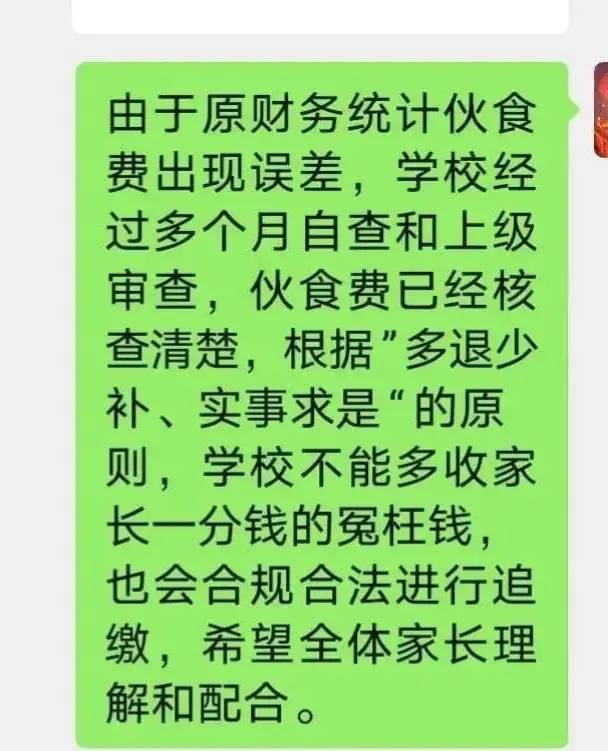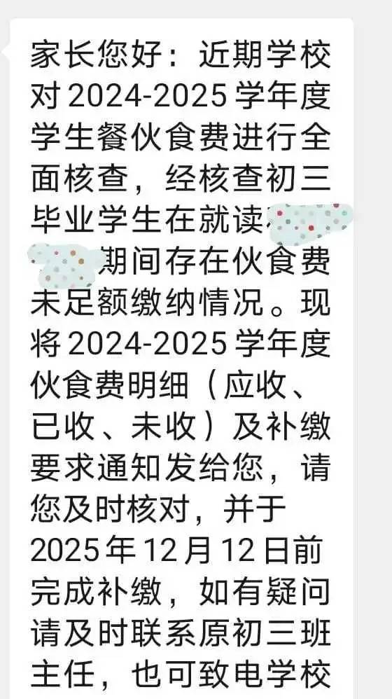 这位网友透露,自己家的老二就读于佛山的一所公办中学,今年7月份已经顺利完成初中学业毕业。本以为孩子毕业之后,关于学校的各项事务都已经尘埃落定,没想到前几天,孩子的初三班主任突然给网友发来了私信。原来,老师已经把班级群解散了,这次发私信是告知网友一个令人意外的消息:由于原财务统计出现误差,孩子还需要补交初三阶段的伙食费,数额高达900多元。