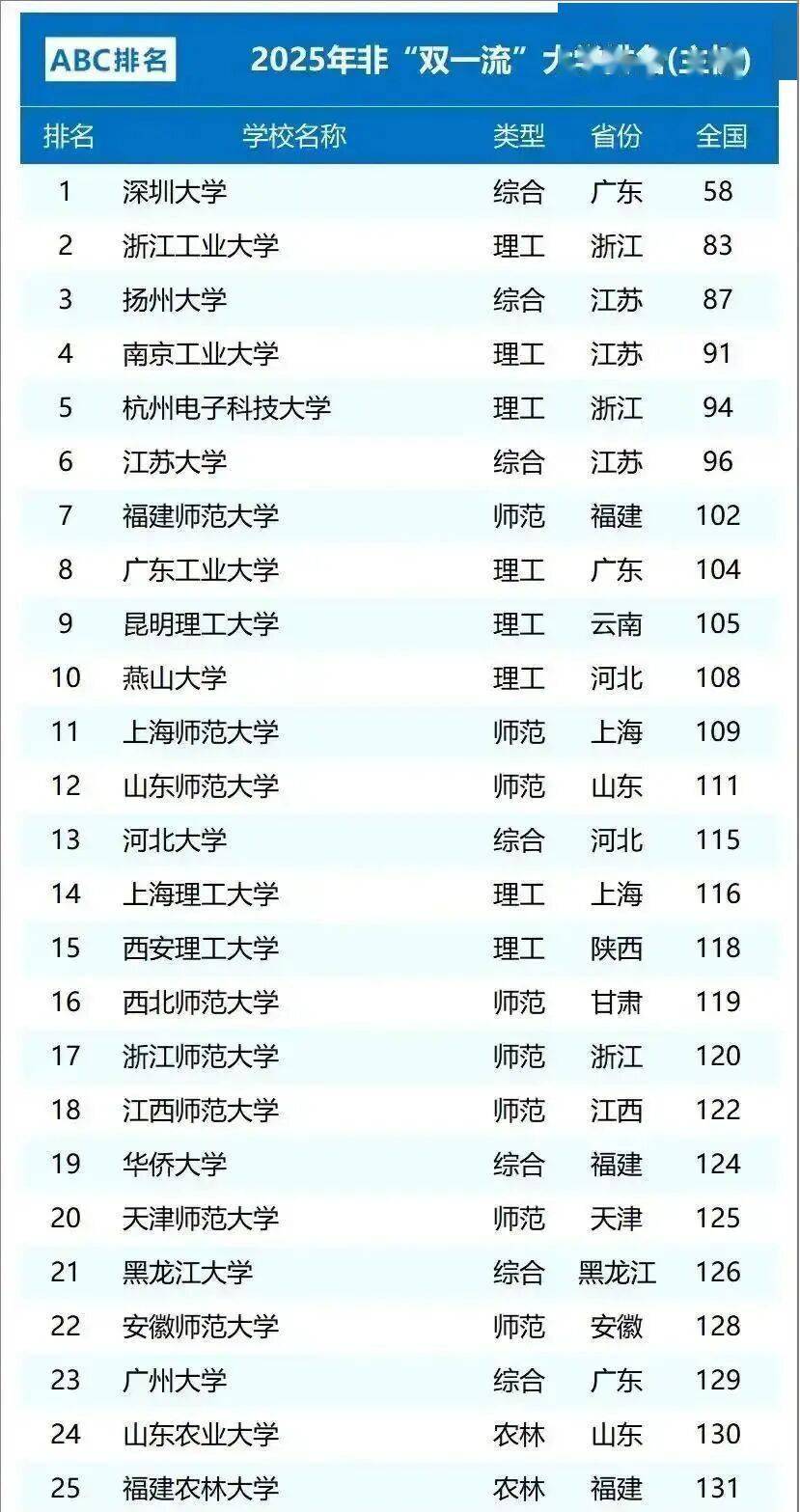 此外,在2025年ABC中国大学排行榜中,还有包括浙江理工大学、武汉科技大学、西安建筑科技大学、河南师范大学、湖南农业大学、山东科技大学、青岛大学、长沙理工大学、河北师范大学、湖北大学等在内的42所双非一本高校跻身全国总榜前150名。