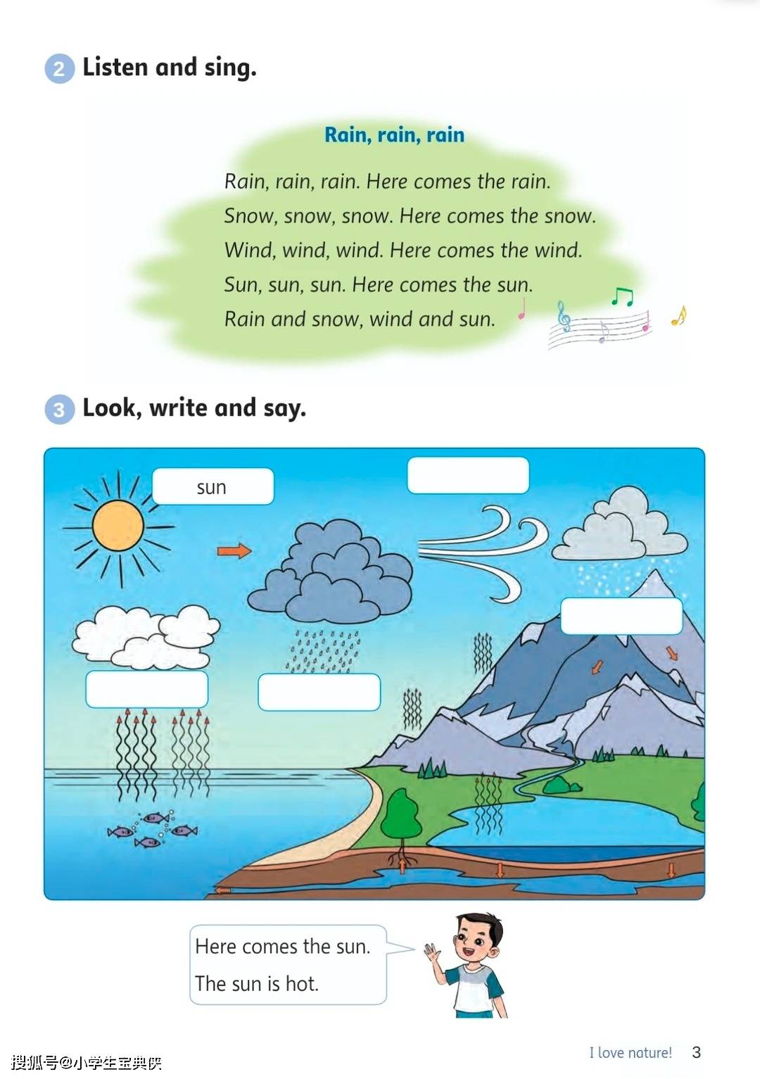 - 自然现象认知:通过 “Here comes the sun” 等内容,学习太阳、云朵、雨水、风、雪等自然事物的英文表达,掌握描述天气特征的基础句型。