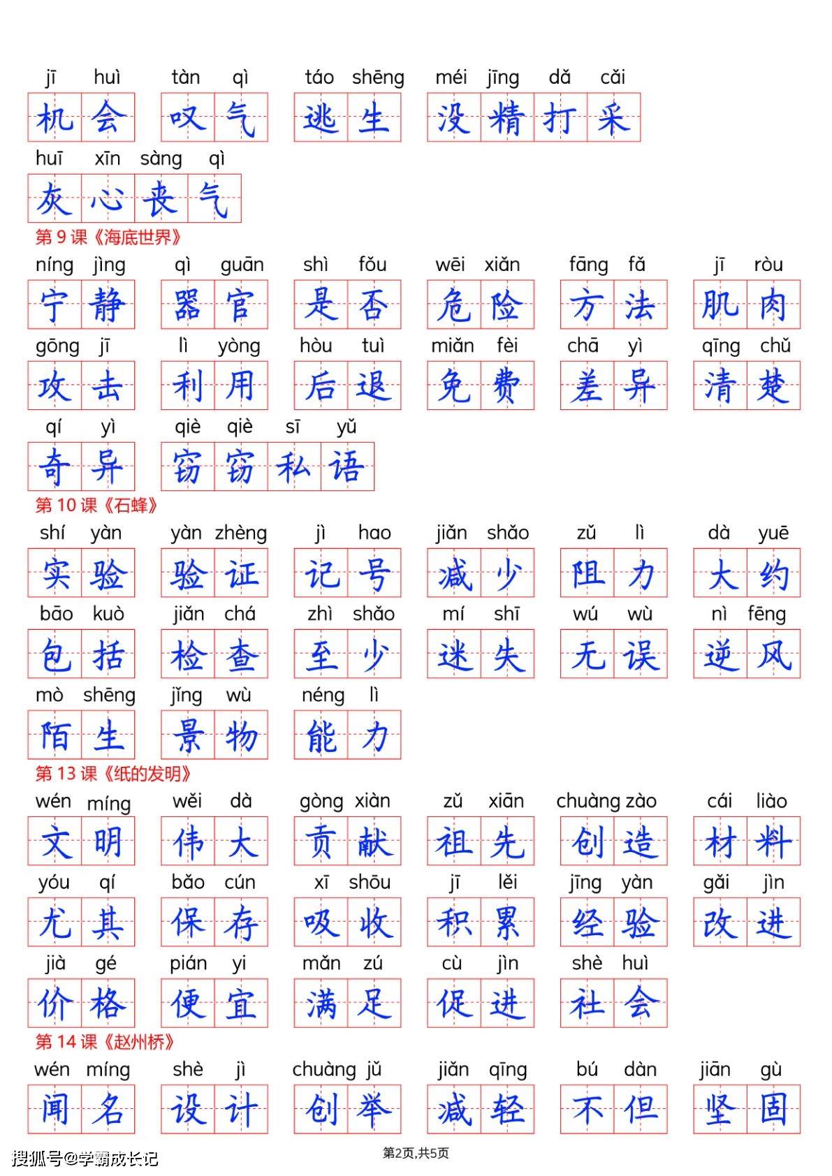 它的内容覆盖了教材中《燕子》《荷花》《海底世界》《赵州桥》等重点课文,以及各单元 “语文园地” 的拓展词语。每一课的词语都以拼音 + 田字格的形式呈现,比如《燕子》里的 “乌黑”“剪刀”“光彩夺目”,《荷花》里的 “清香”“莲蓬”“了不起”,都是课文中的高频词汇。资料还包含了《会摇尾巴的狼》《鹿角和鹿腿》等寓言故事的词语,以及《纸的发明》《赵州桥》这类说明文中的专业词汇,如 “创造”“贡献”“创举”,能帮助学生全面掌握课内字词。