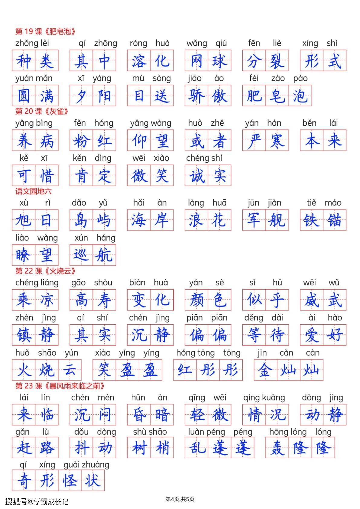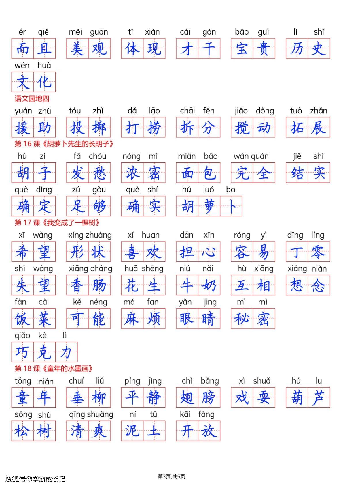对学生而言,这份资料的价值在于将零散的课文词语整合为系统的练习清单,让他们能按课文顺序逐一巩固,避免遗漏。它的排版清晰,每个词语都配有拼音和书写格,适合寒假自主预习或课后复习。学生可以通过默写、订正的闭环,扎实掌握全册生字词,提升识字量和书写准确性,为后续的阅读与写作筑牢基础。