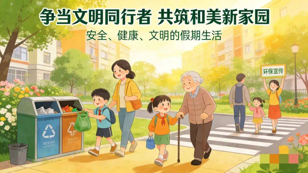 文明是成长的底色,需要家校共同涵养。请同学们待人谦和有礼,尊敬长辈、友爱同伴,多用文明用语、践行礼貌行为;自觉遵守公共秩序,爱护公共设施、保护生态环境,不随地吐痰、不乱扔垃圾,主动参与家庭和周边的清洁整理;树立节约意识,践行光盘行动,节约用水、用电、用纸,让勤俭节约成为日常习惯。请家长朋友们言传身教,以身作则示范文明行为,引导孩子遵守社会公德,带领孩子参与家庭清洁、社区公益等活动,让文明素养在潜移默化中传递。