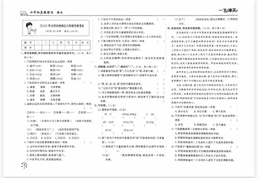 2026春天津一飞冲天小升初真题精选语文(电子版可打印)