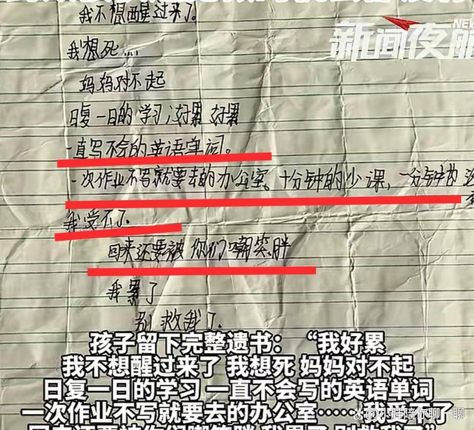 你敢信吗?一个12岁女孩的生命,竟然被一堆英语作业压垮了!1月11日,一则痛彻心扉的消息冲上热搜:一名小学生在家吞下姥姥的100粒心脏病药,决绝地离开了这个世界。她留下的遗书,字字泣血:“我好累,我不想醒过来了……日复一日的学习,一直不会写的英语单词……回来还要被你们嘲笑胖。”而她的妈妈,对着镜头撕心裂肺地哭喊:“没有英语作业,她是不会走的!” 这真的仅仅是作业的错吗?压死骆驼的,难道只是最后一根稻草?