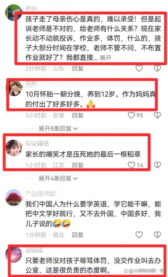 事件曝光后,网络舆论场迅速“分裂”成好几派,吵得不可开交。一派坚定地站在妈妈这边,认为“作业猛于虎”,老师不近人情的教育方式是罪魁祸首,学校负有不可推卸的责任。他们举出身边或网上的例子,痛斥当前教育的内卷和压力如何扭曲孩子的心灵。另一派则把矛头转向家庭,特别是遗书中那句“被你们嘲笑胖”。他们认为,家庭的言语伤害、特别是对青春期孩子敏感心理的忽视,才是压垮孩子的“内部根源”,家长的责任更大。还有一派发出“和稀泥”但也显无奈的感慨:家长难,老师难,孩子难,现在教育就是个“死结”。