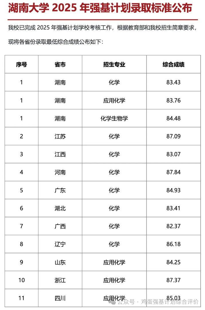 2025 年湖南大学强基计划招生专业为化学、应用化学、化学生物学,均要求物理 + 化学(综合改革省份)或理科(非改革省份);综合成绩按高考 85%+ 校测 15% 计算,各省各专业录取线差异明显;真题以面试为主,侧重化学专业素养与科研潜力,无公开完整试卷,以下为详细汇总。