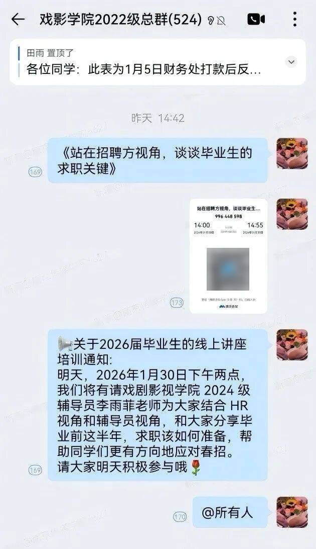 2026年1月30日,戏剧影视学院面向2022级毕业生线上举办就业指导专题讲座。本次讲座以“站在招聘方视角,谈谈毕业生的求职关键”为主题,由2022级辅导员靳蕊老师主持,2024级辅导员李雨菲老师主讲,2022级全体学生及各毕业班辅导员共同参加。讲座围绕当前就业形势、岗位认知、求职路径选择以及简历与面试准备等内容,为毕业生系统梳理春招阶段的求职重点与方法。