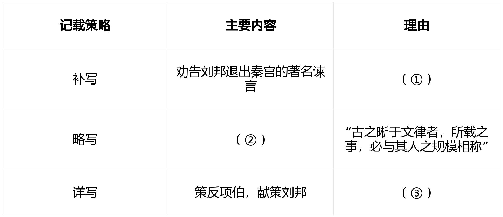 【分析】①王又朴强调《史记》需“使后世有所观感以为鉴”,所以应补写张良富有借鉴价值的言论,为后世提供借鉴。②张良为谋士,记载需“与其人之规模相称”,故应省略项庄剑斗、樊哙冲帐等武力冲突,详写“运筹”之事。③方苞强调要写“天下所以存亡”,张良策反、谏止与部署逃亡、断后应对都直接关乎刘邦这一方势力的存亡与历史走向,需要详细记载。
