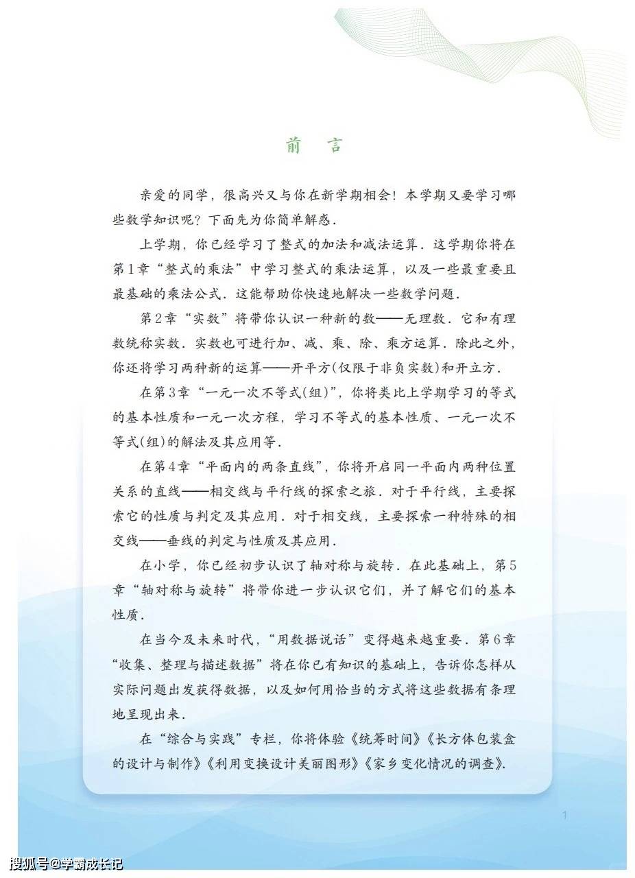 今天为大家分享:这本湘教版七年级下册数学课本,封面那座在水天之间闪耀的 “蛋壳” 建筑,仿佛象征着我们即将进入的数学世界 —— 它既有严谨的结构之美,又充满了无限的创造可能。从整式的乘法到数据的收集,这本课本如同一把钥匙,为我们打开了通往更广阔数学天地的大门。